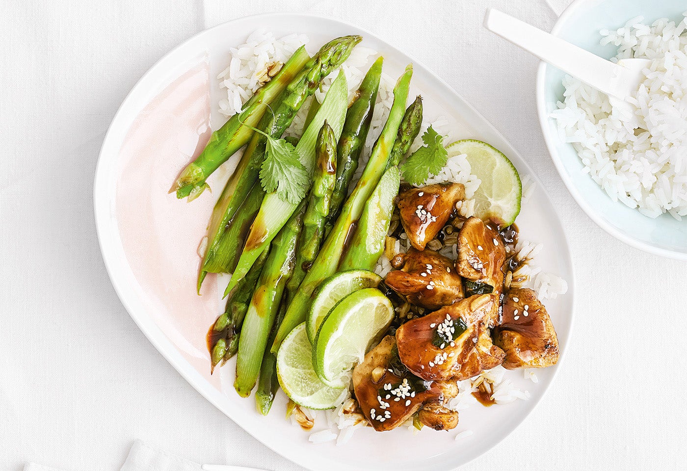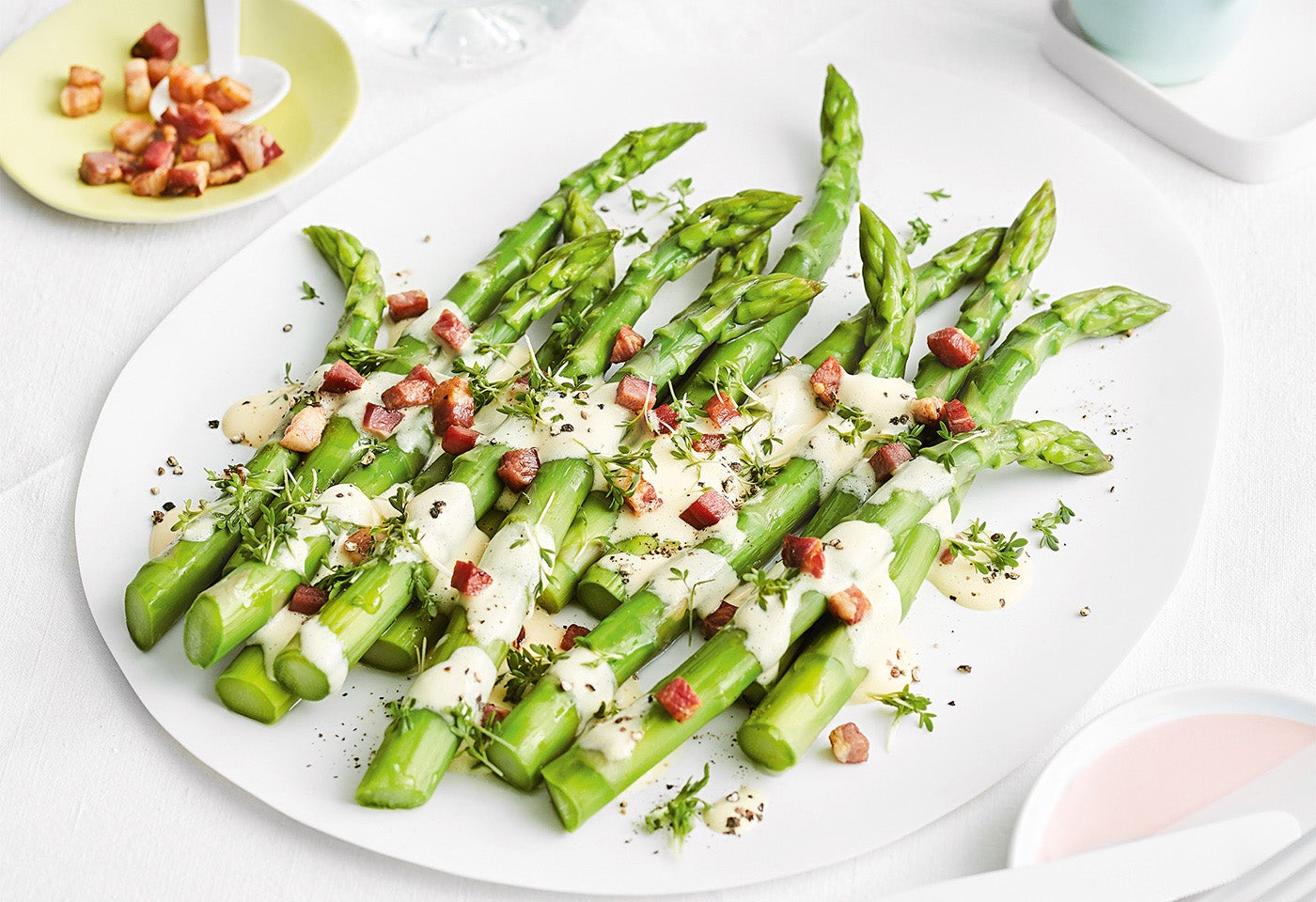 Grüner Spargel mit Sauce Hollandaise und Speck