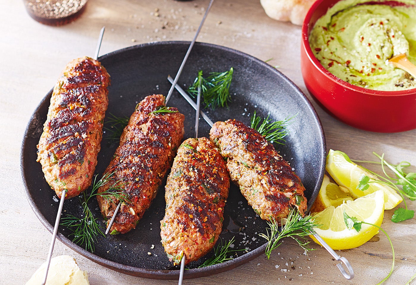 Bio-Faschiertes am Spieß mit Gurkenhummus