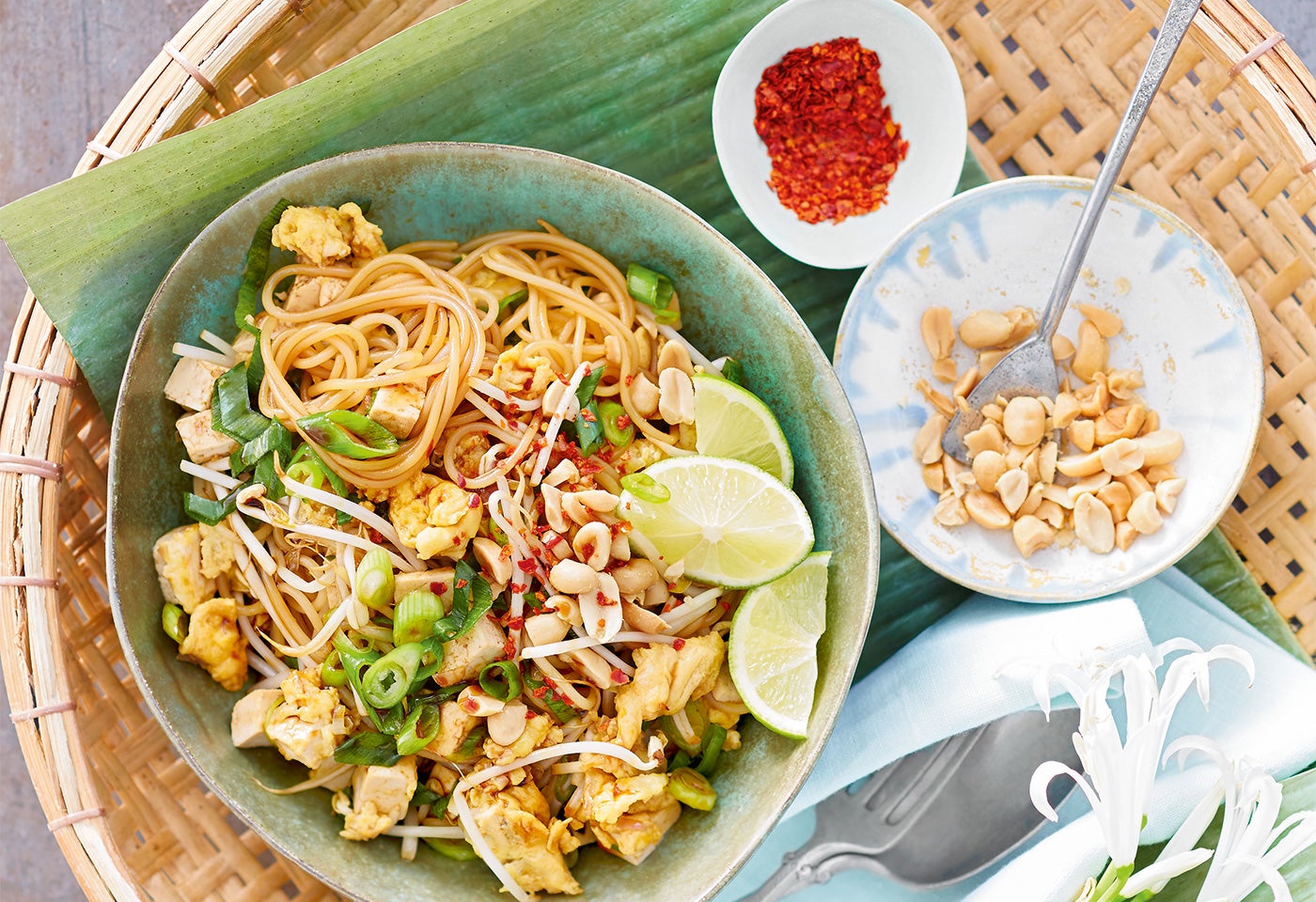 Gebratene Reisnudeln mit Tofu, Sojasprossen und Ei