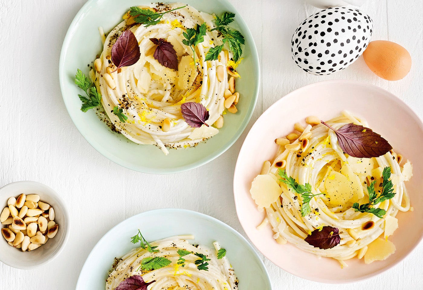 Spaghettinester mit Zitronen-Frischkäse-Sauce und Kräutern