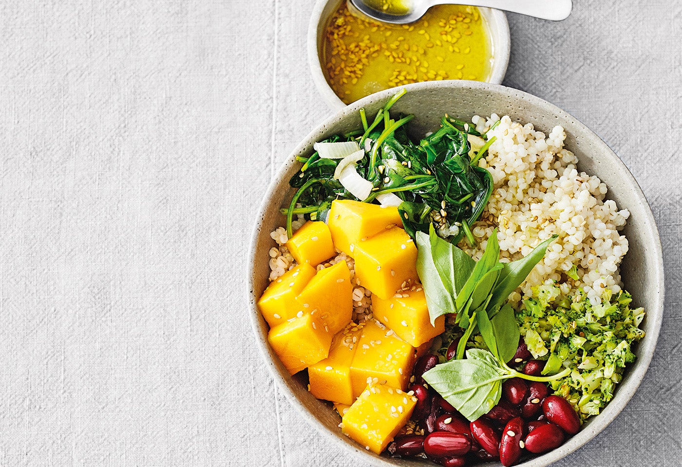 Rollgerste-Bowl mit Brokkoli, Mango und Kidneybohnen