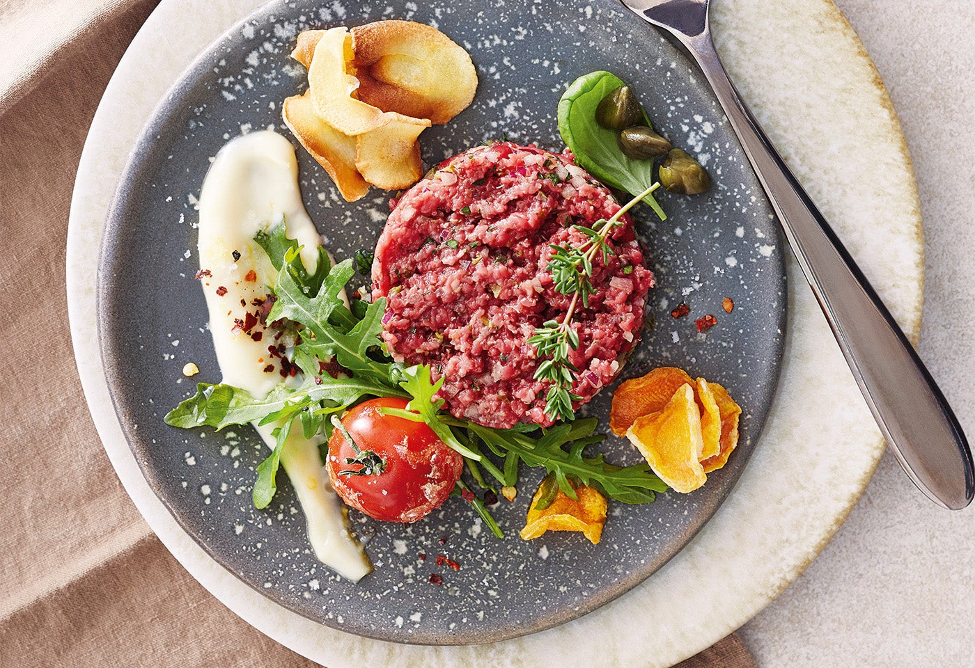Beef Tatar mit Gemüsechips und Zitronenmayonnaise