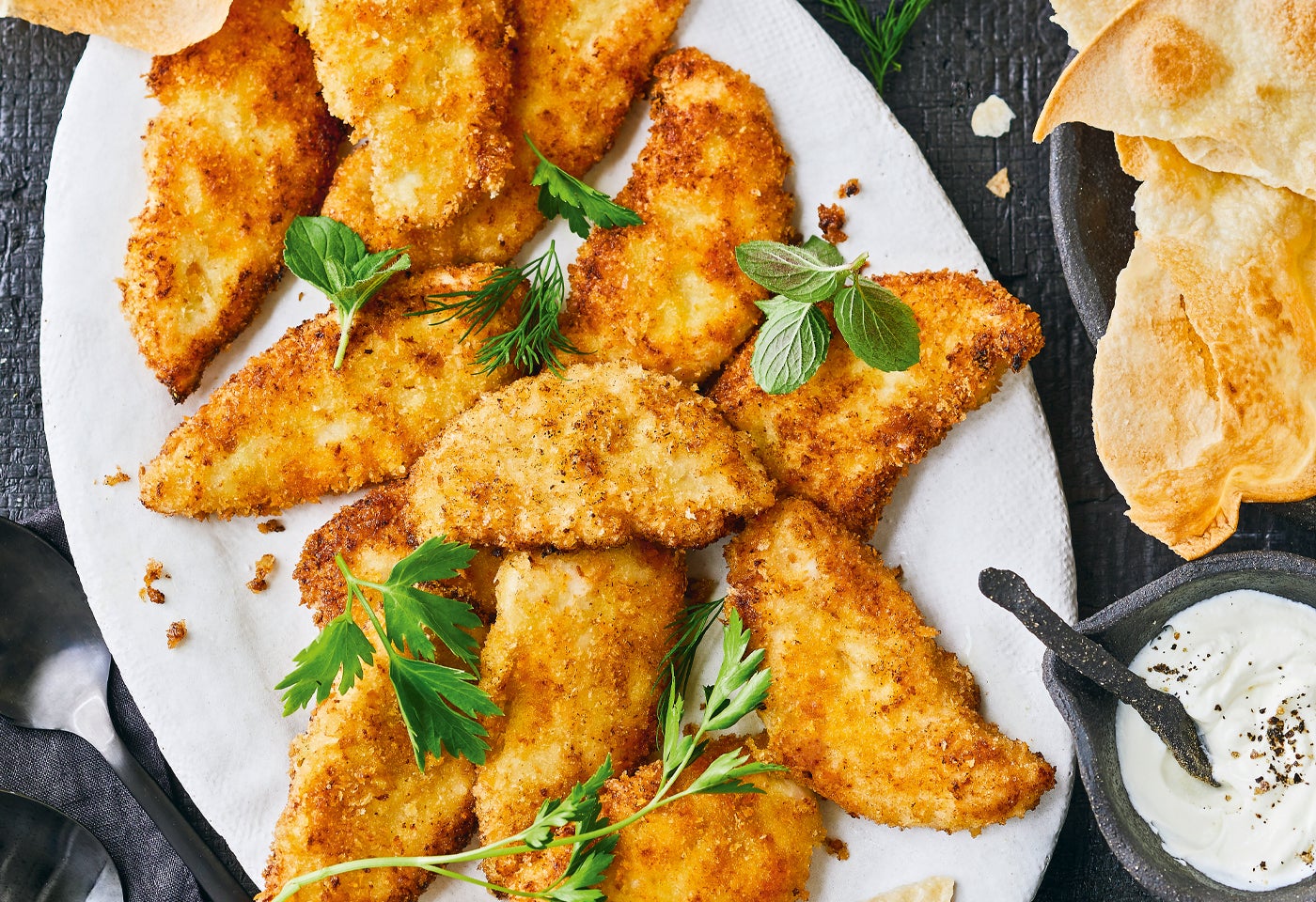 Gebackene Honig-Hendl-Innenfilets mit Gurkensalsa und Tortillafladenchips