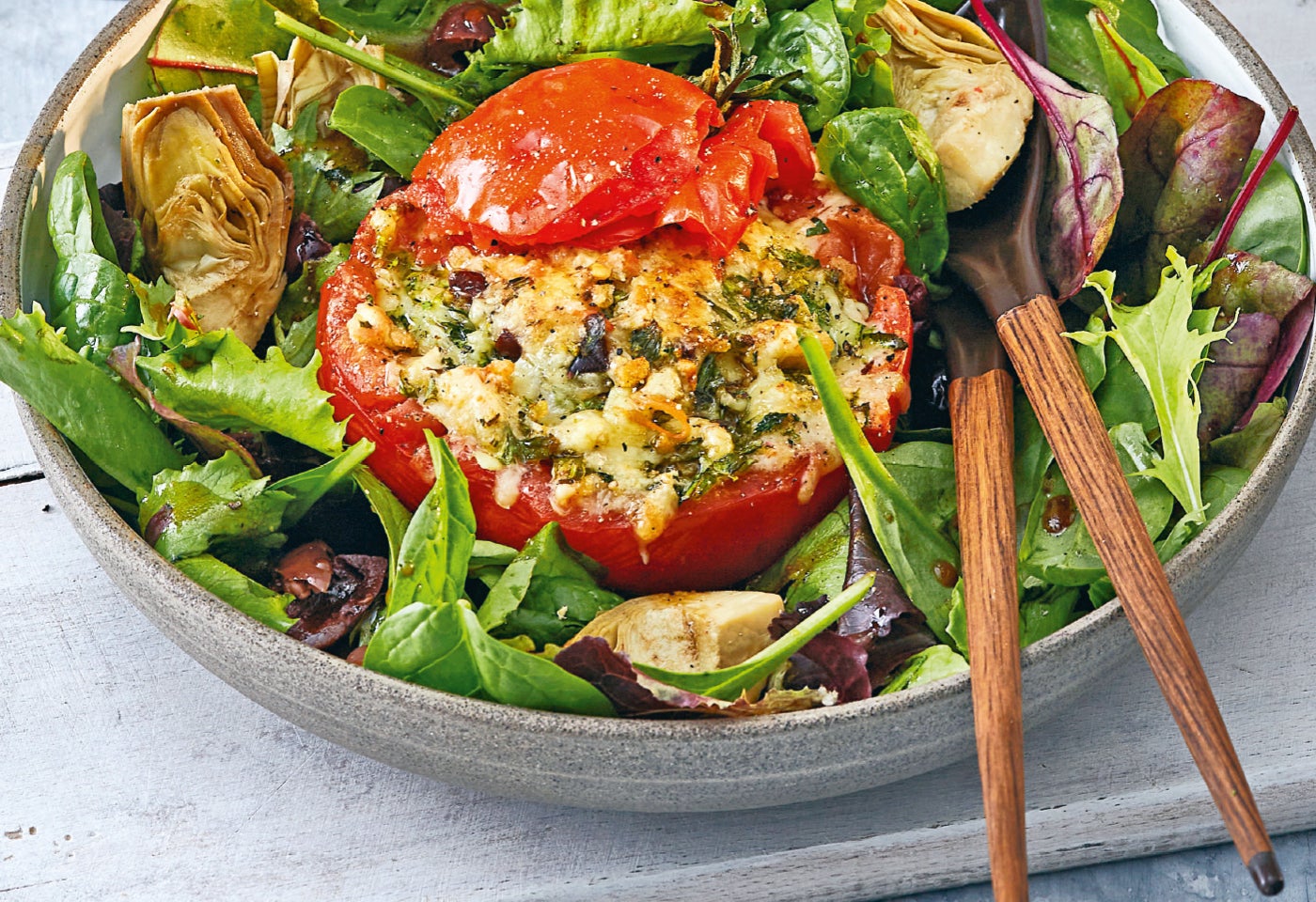Gefüllte Ofentomate auf mediterranem Pflücksalat