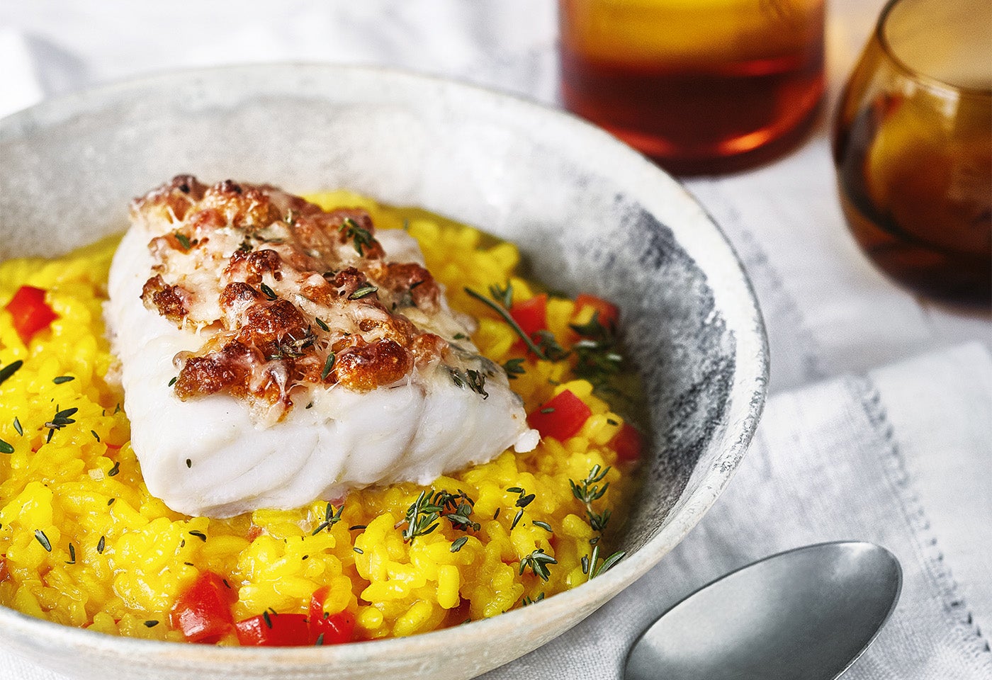 Kabeljau mit Pecorinokruste und Safran-Paprika-Risotto