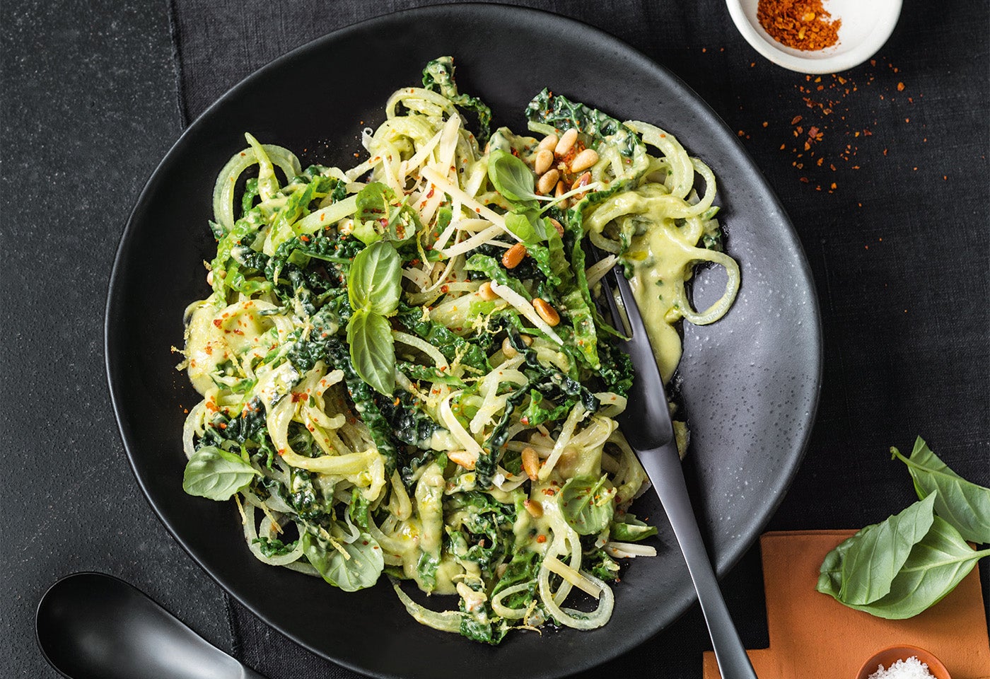 Kohlrabi-Pasta mit Kohl und Avocadosauce