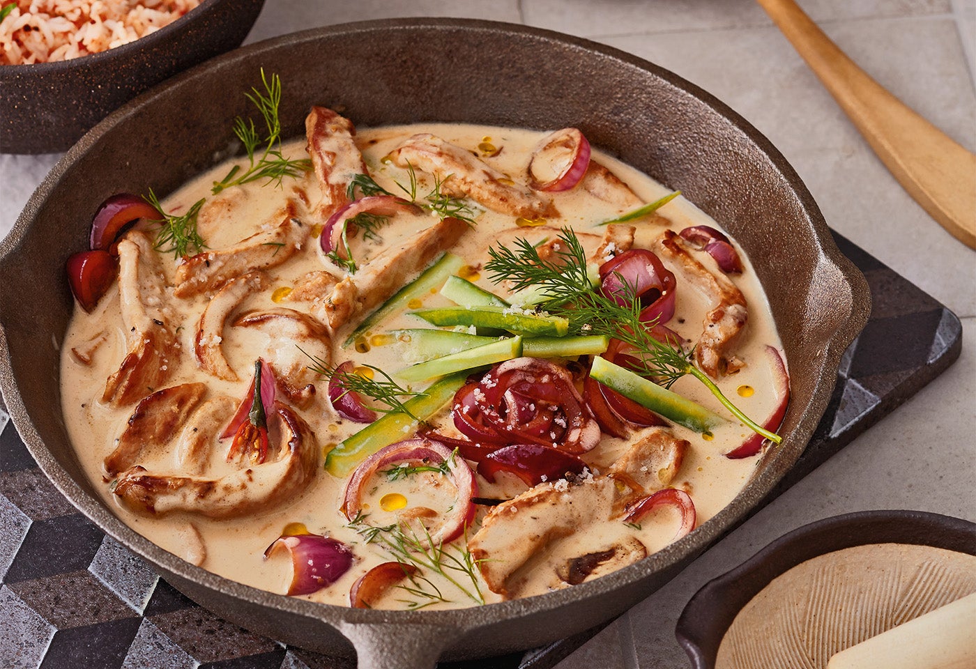 Schweins-geschnetzeltes mit Kokossauce mit Tomatenreis