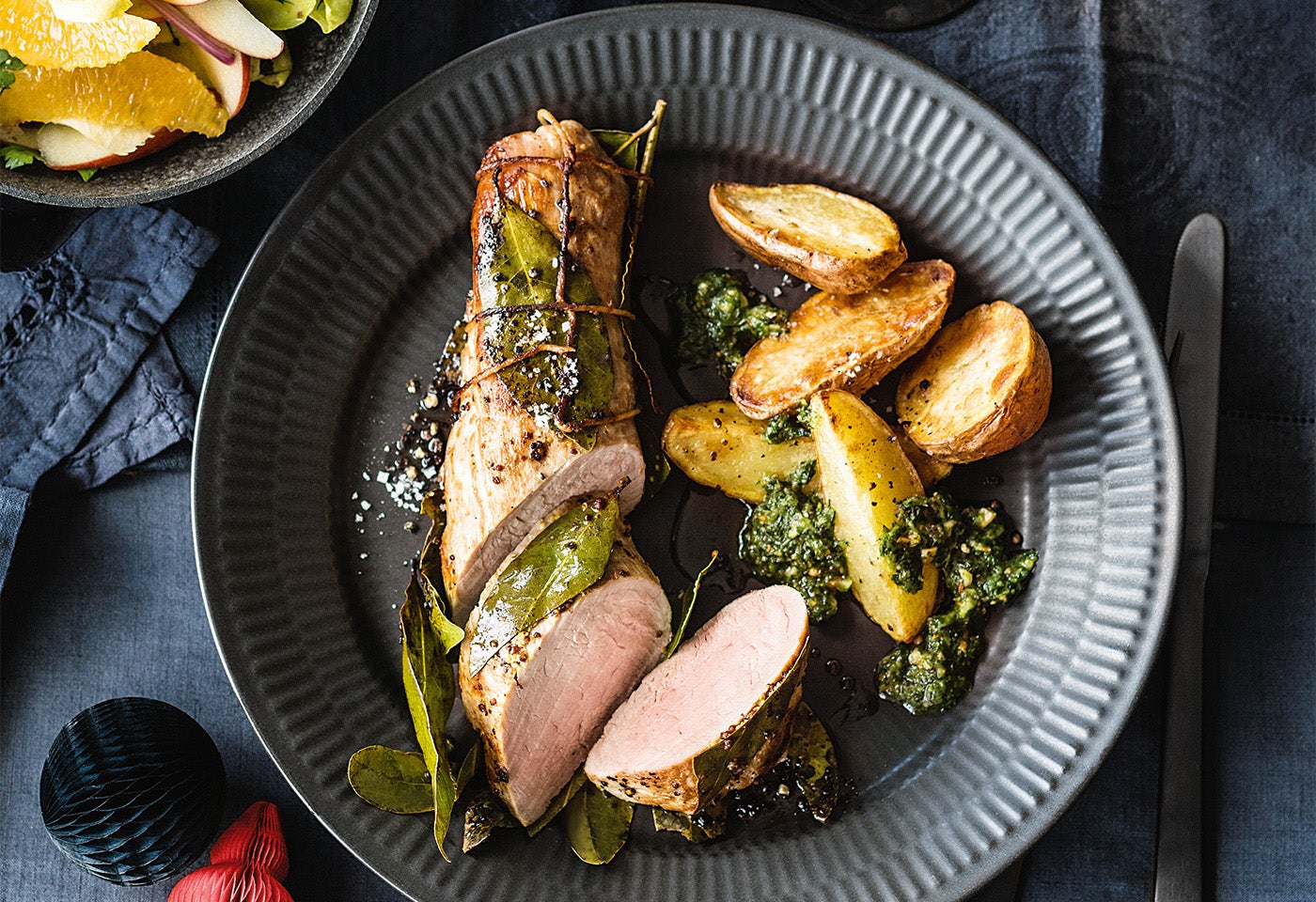 Schweins-lungenbraten mit Pesto-Erdäpfeln und Wintersalat