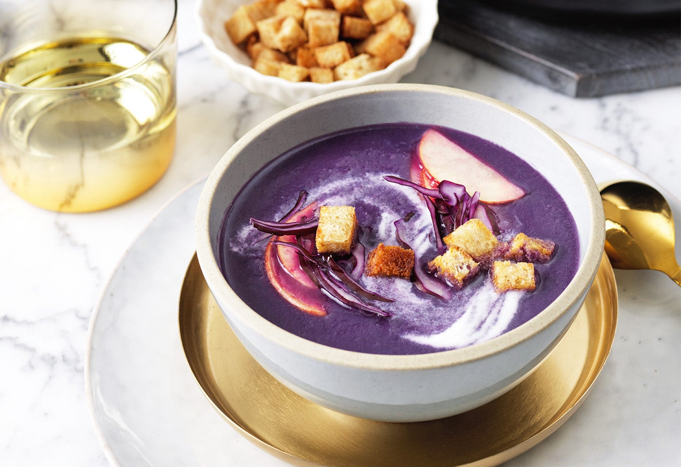 Rotkrautsuppe mit Apfel und Zimt-Croûtons