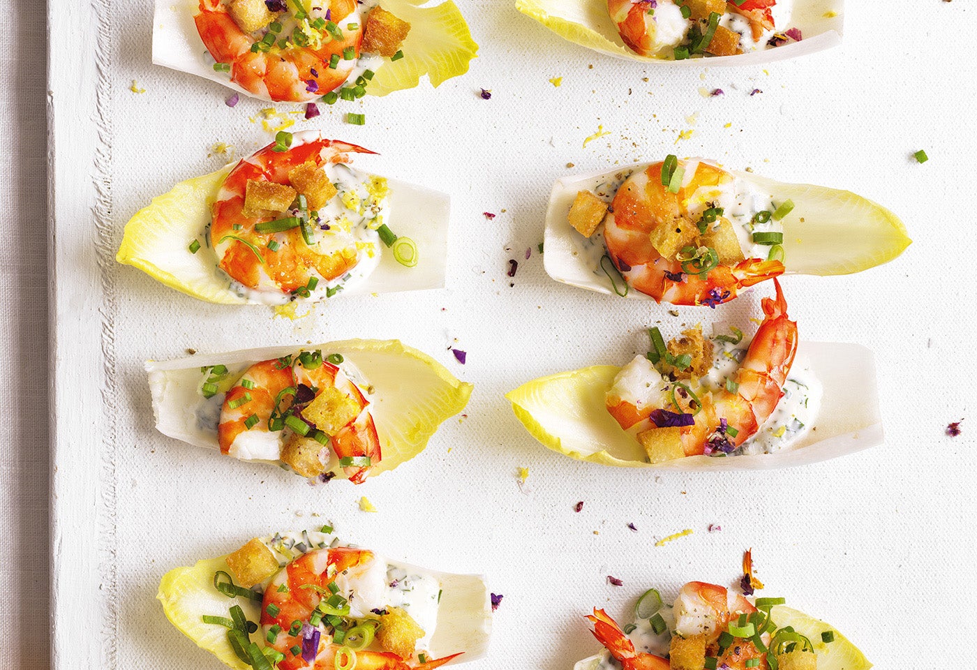 Chicorée mit Garnelen und Limetten-Ingwer-Mayonnaise