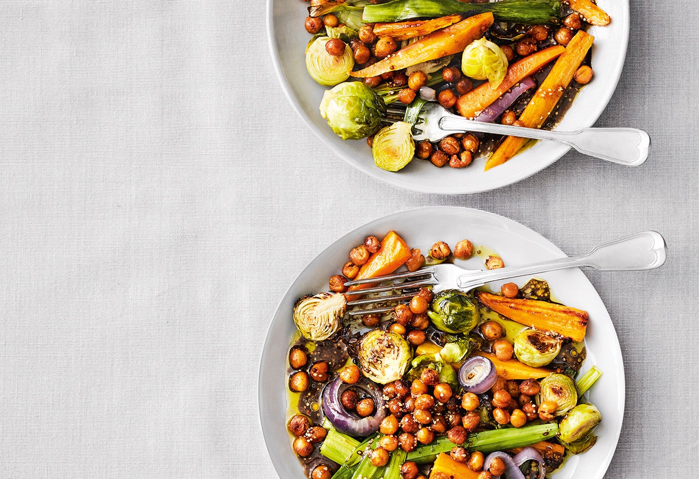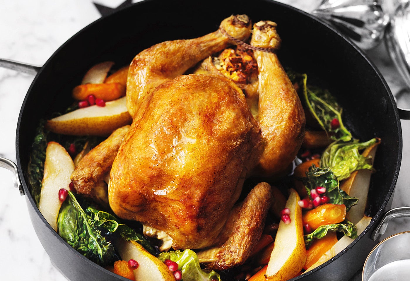 Brathuhn mit Nuss-Semmel-Füllung mit Birnengemüse