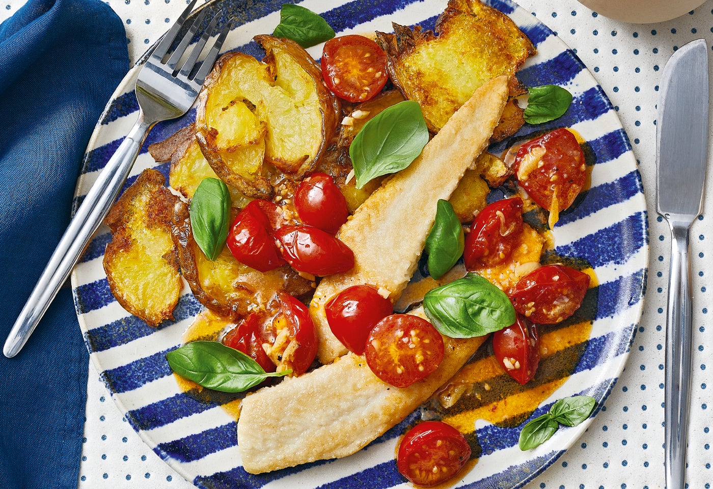 Pangasiusfilet mit Knuspererdäpfeln und Tomaten