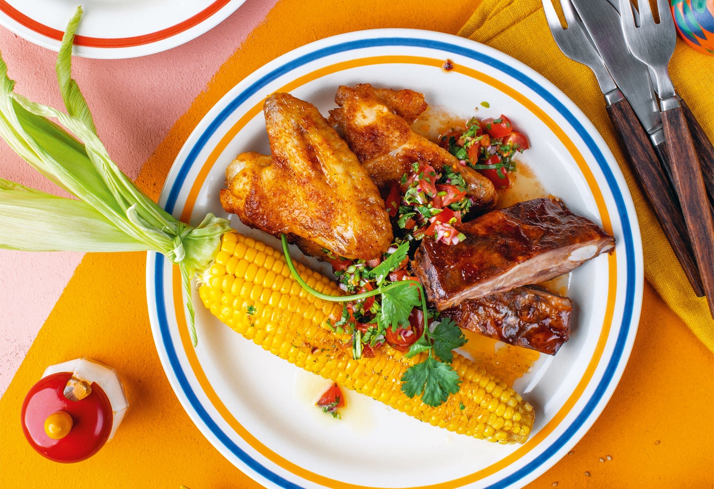 Tex-Mex-Platte mit Chicken Wings, BBQ Ribs, Grillmais und Fladenbrot