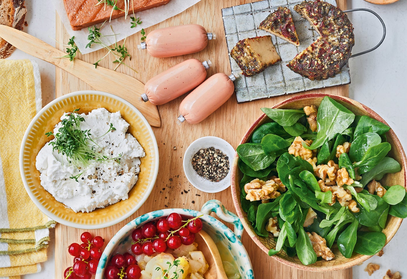 Herzhaftes pflanzliches Jausenbrett mit Birnenchutney und Walnuss-Vogerlsalat