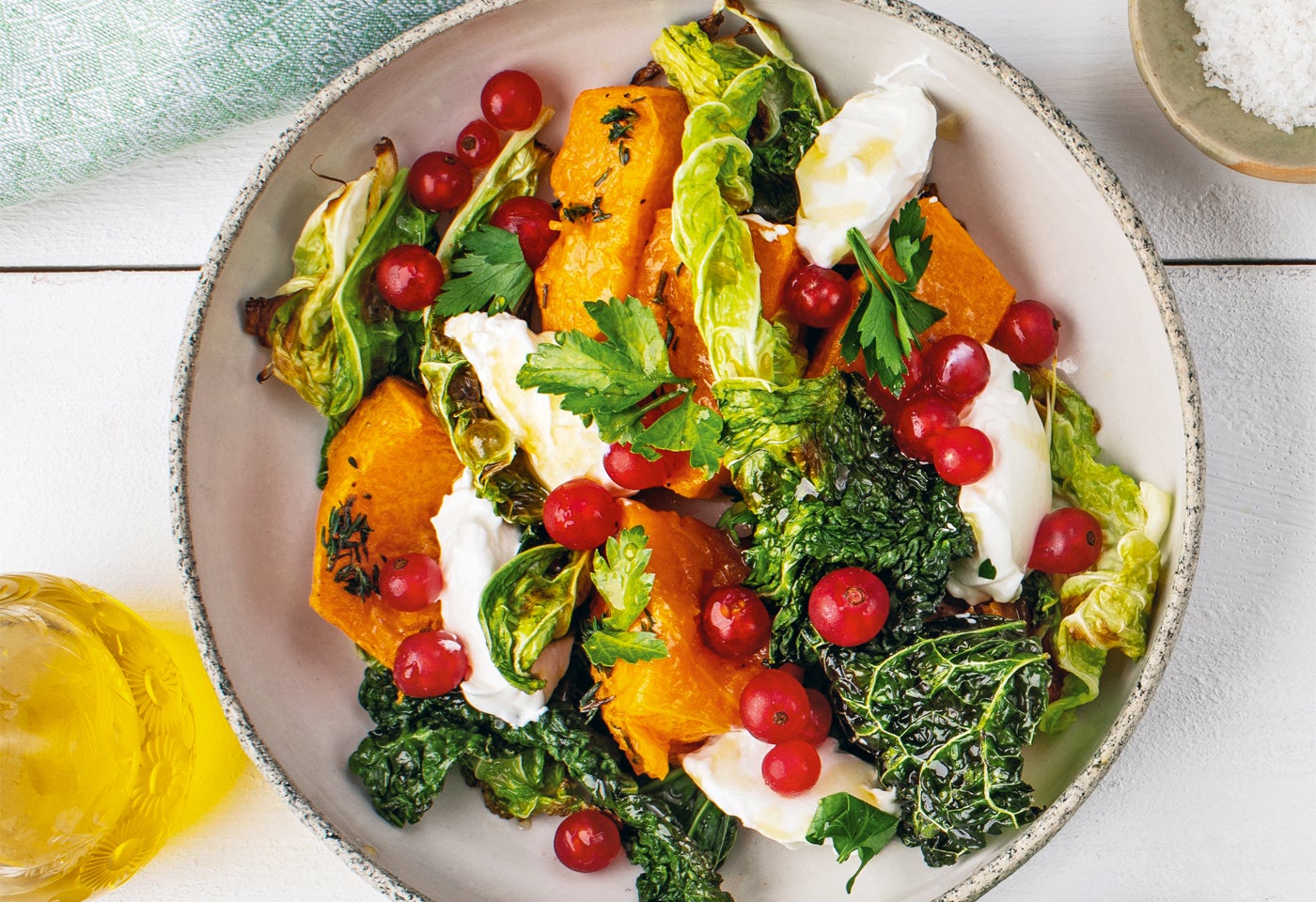 Kürbis-Kohl-Salat mit Ziegenfrischkäse mit Ribiseln