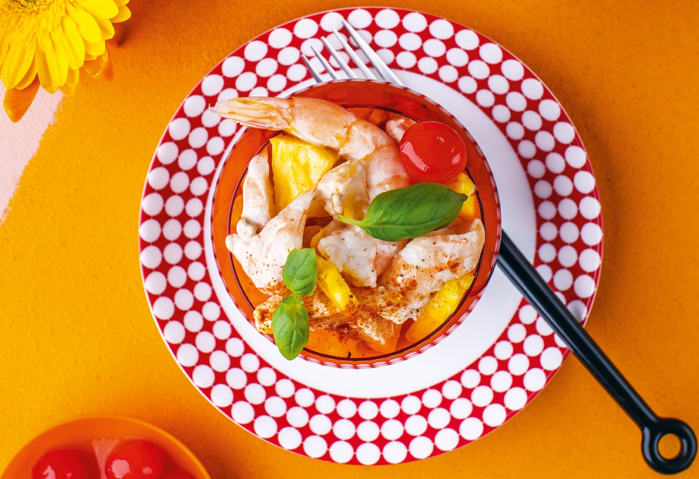 Shrimps-Erdäpfel-Salat Hawaii mit Thousand Island Sauce