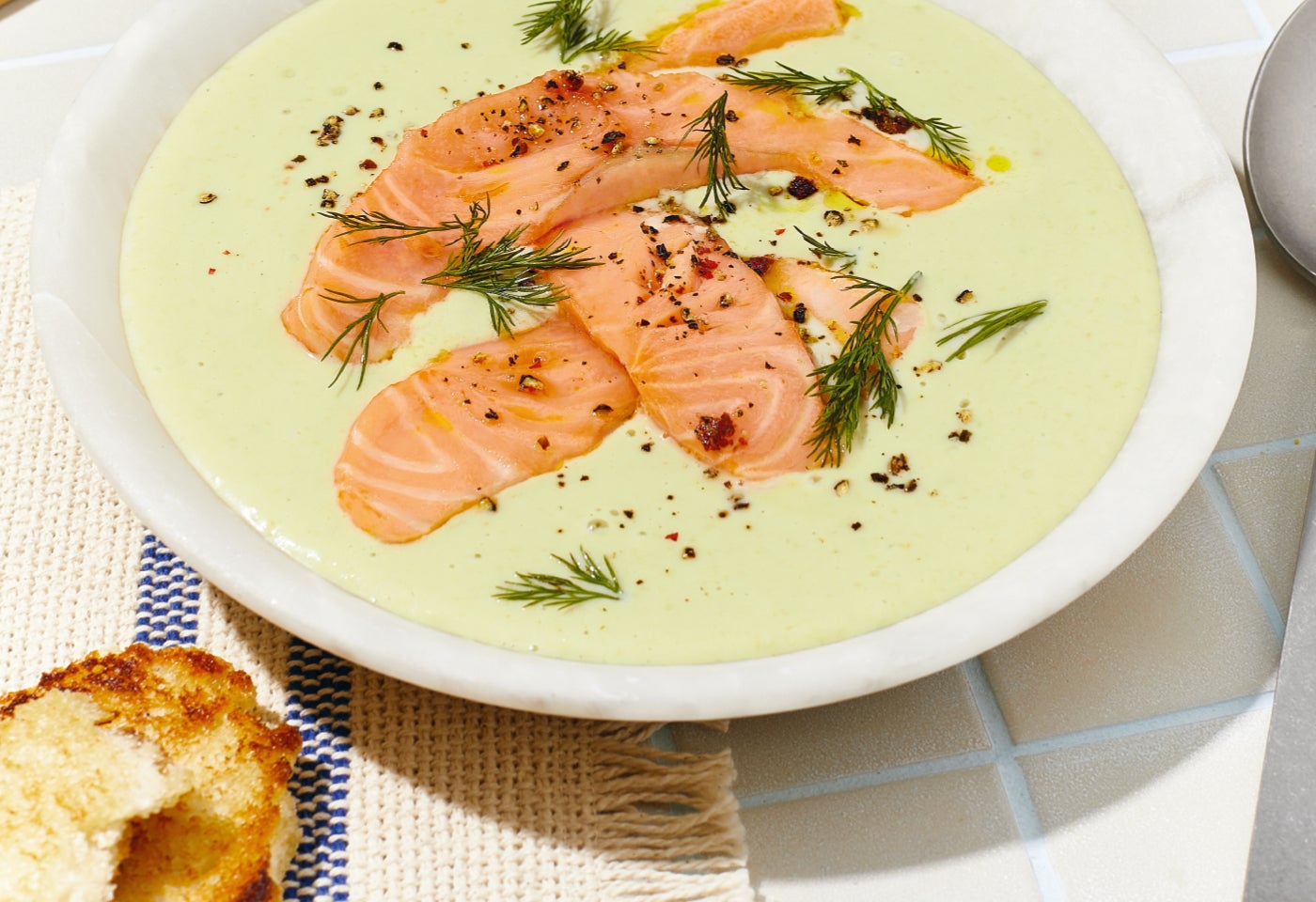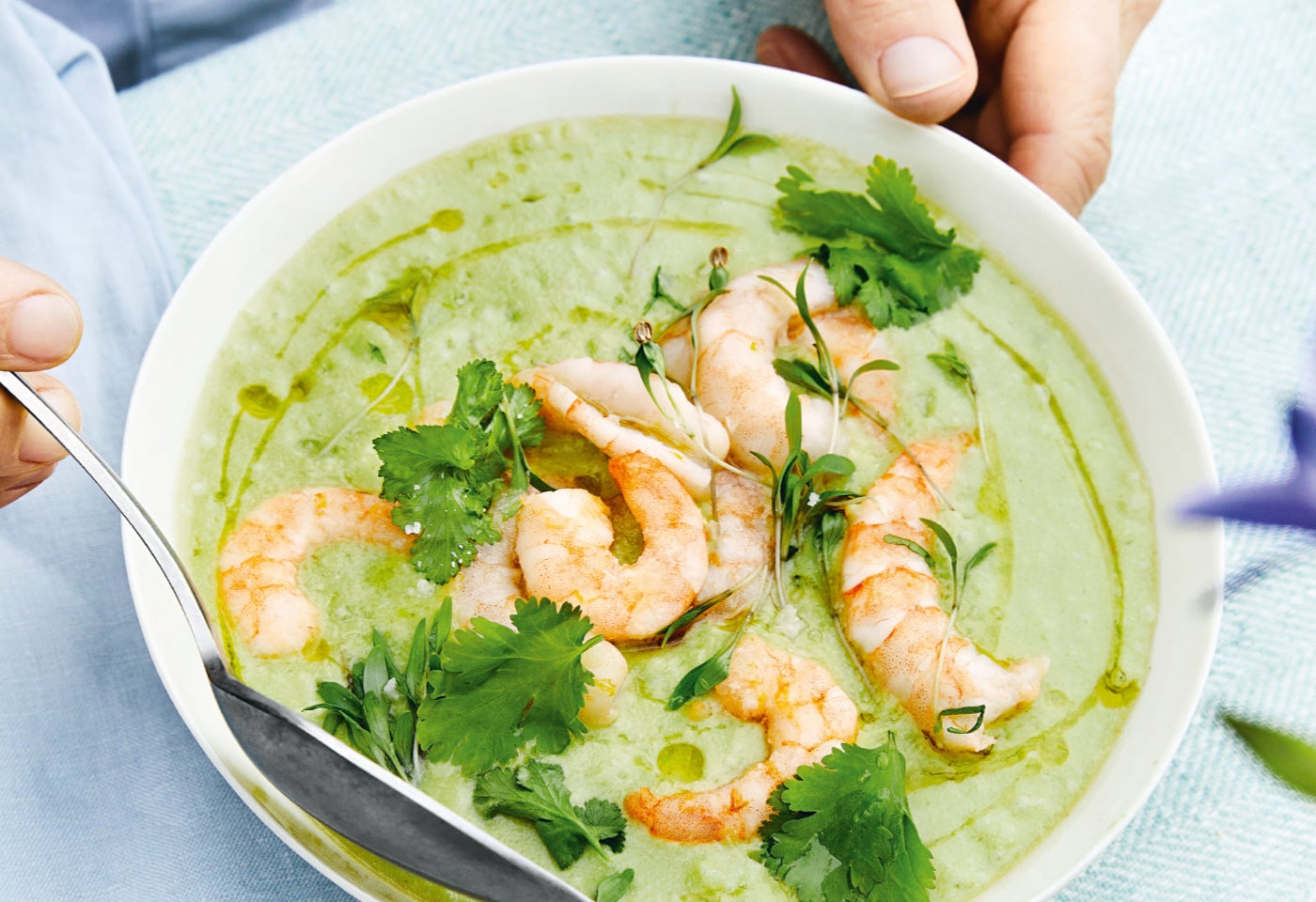 Asiatische Kokos-Gurken-Gazpacho mit Garnelen