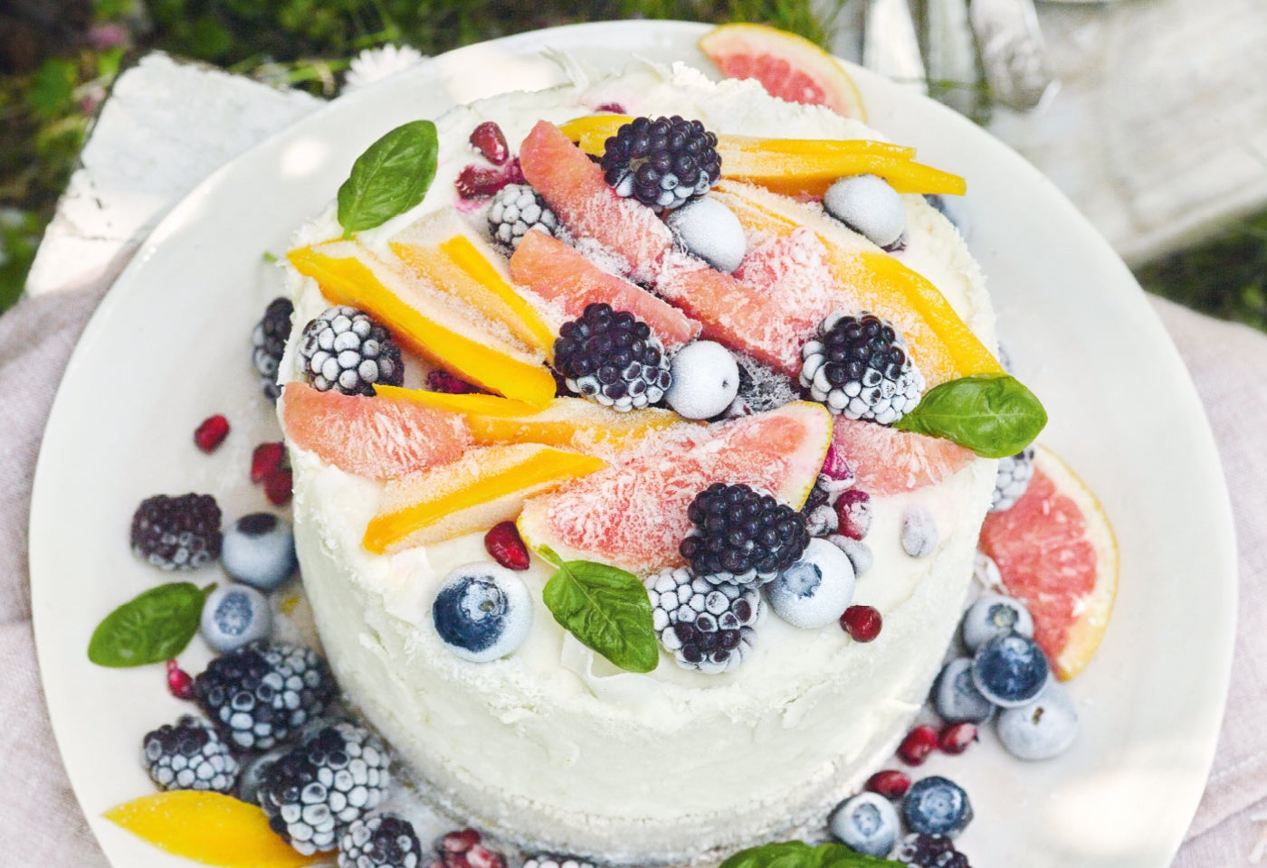 Kokoseis-Mango-Torte mit Beeren und Zitrusfrüchten