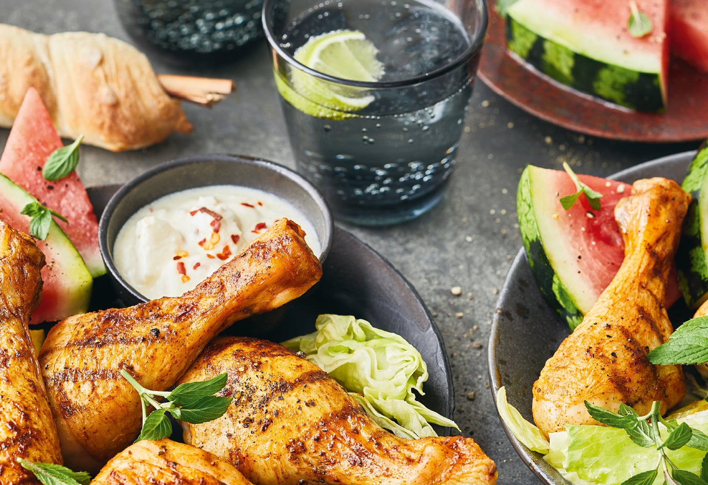 Gegrillte Drumsticks mit Melonen-Eissalat und Feta-Dip