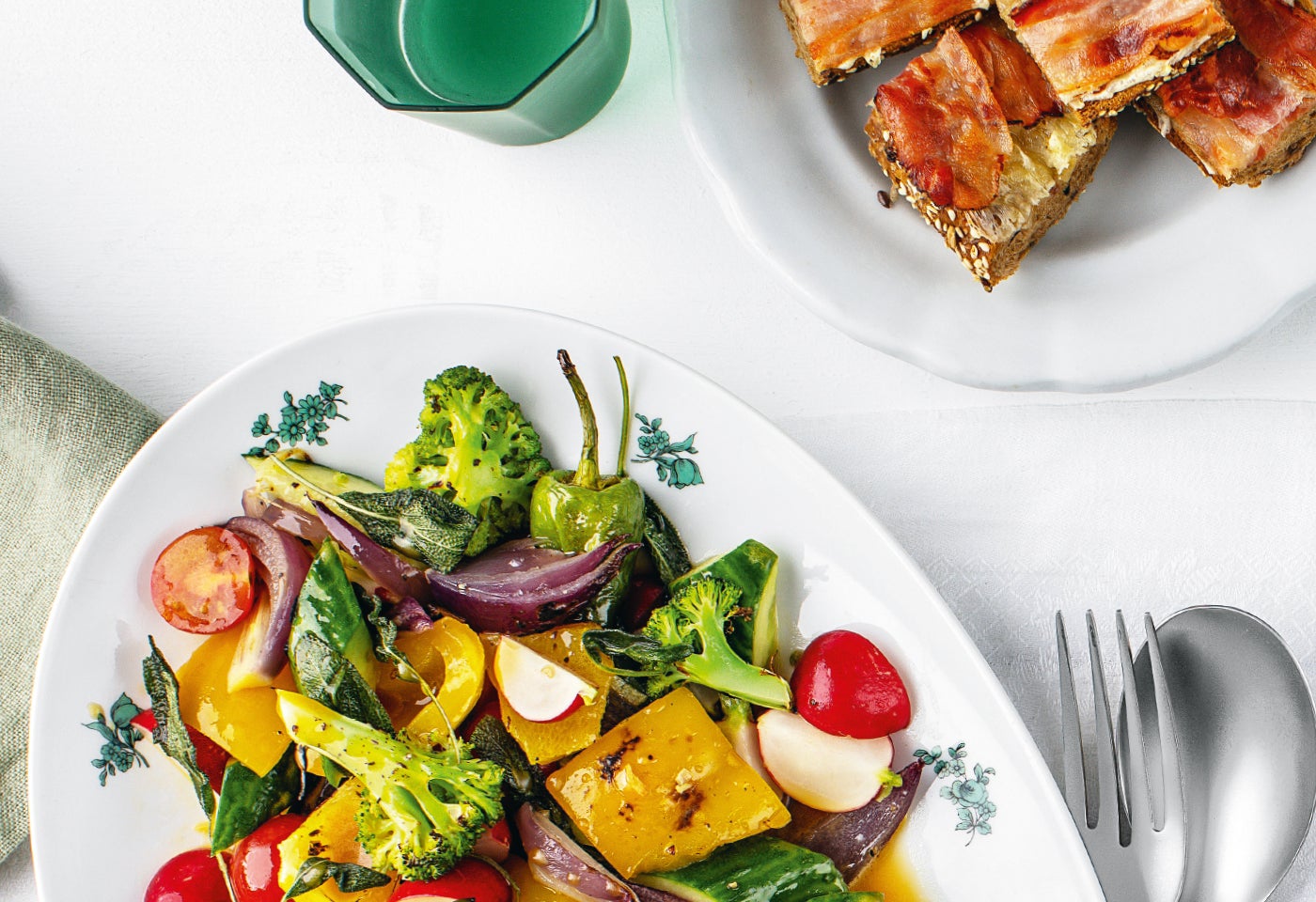Ofengemüse-Salat mit Speck-Käse-Baguette