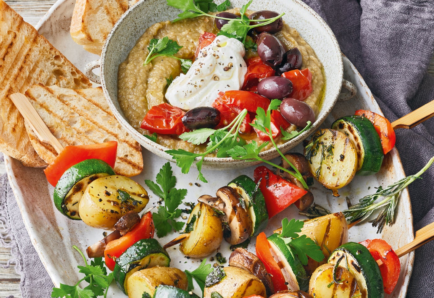 Erdäpfel-Gemüse-Grillspieße mit Baba Ganoush und Grilltomaten