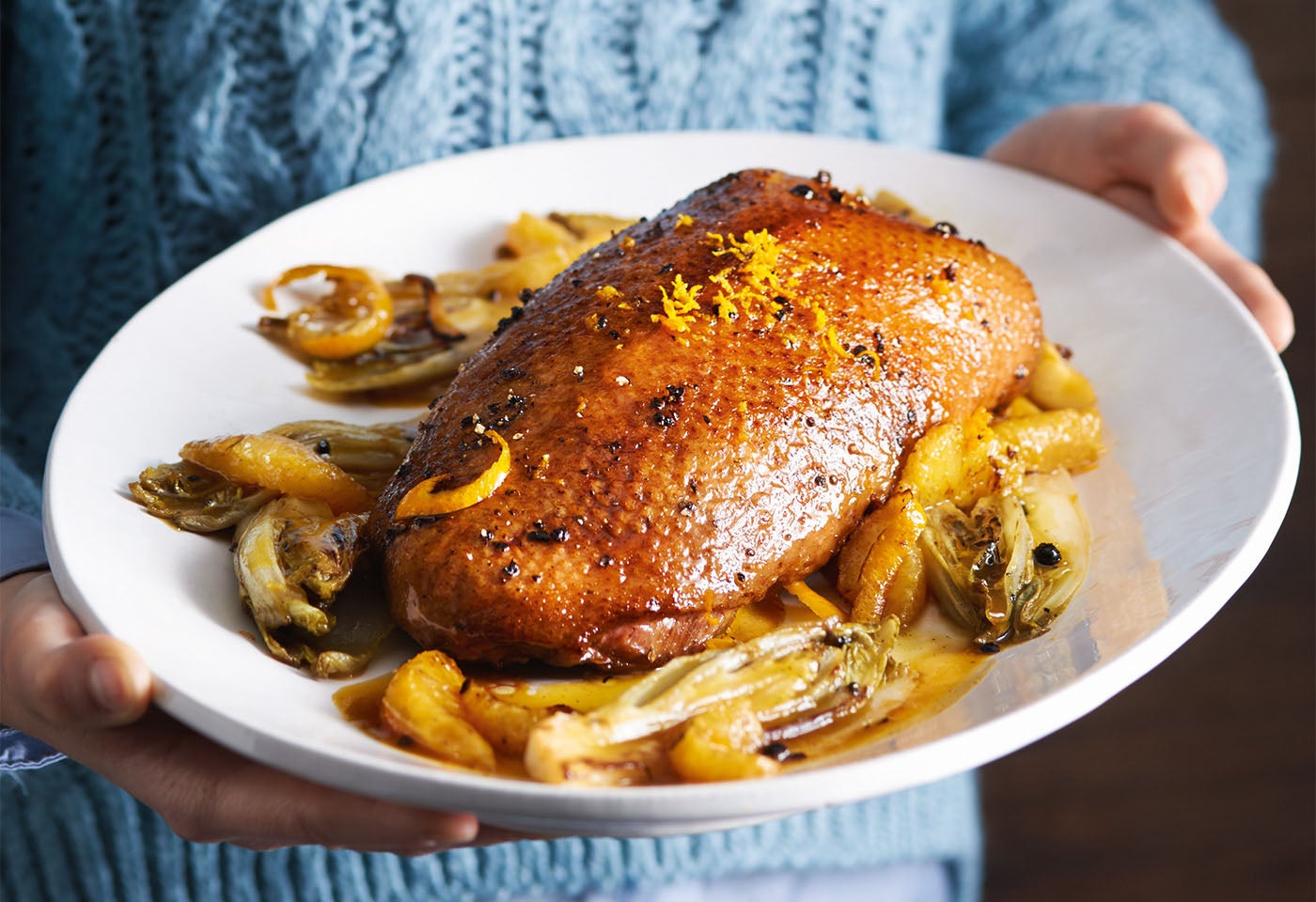 Gänsebrust mit karamellisiertem Chicorée und Orangen