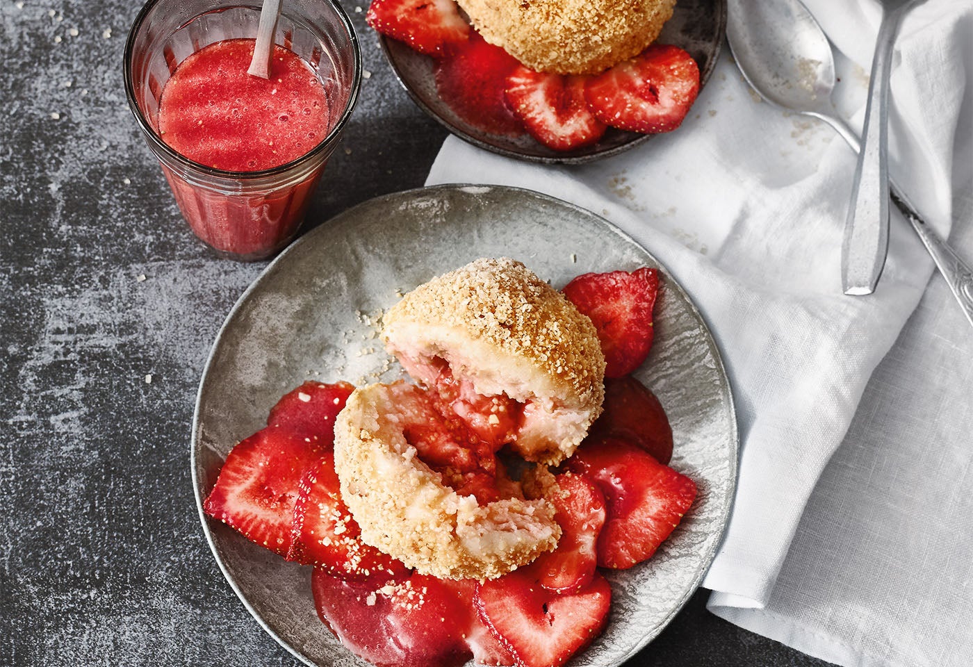 Erdbeerknödel mit Mandelbröseln und Erdbeerpüree