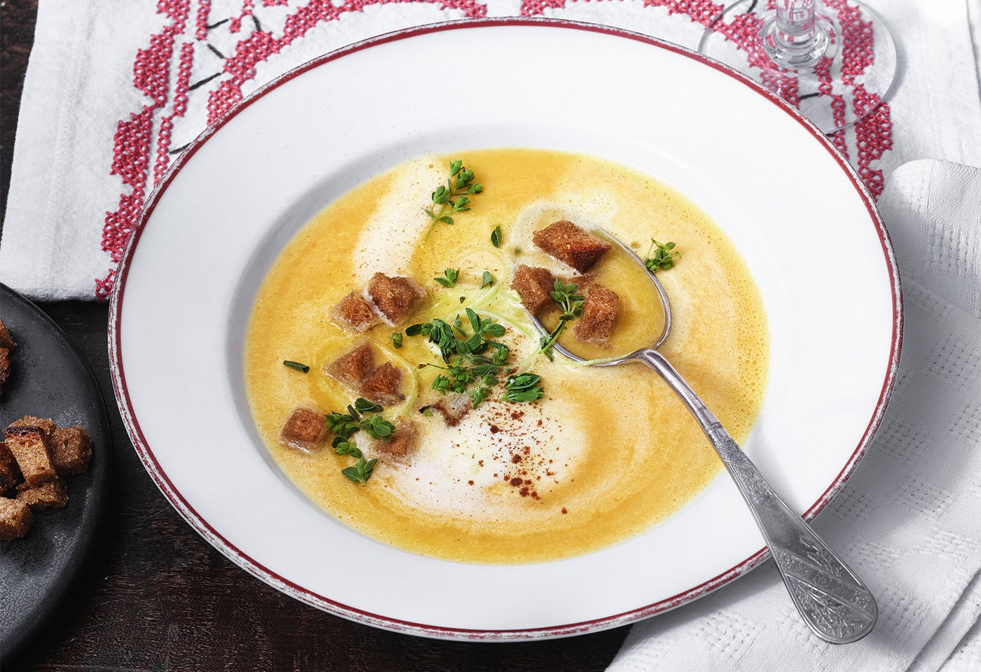 Mostschaumsuppe mit Knoblauch-Croûtons
