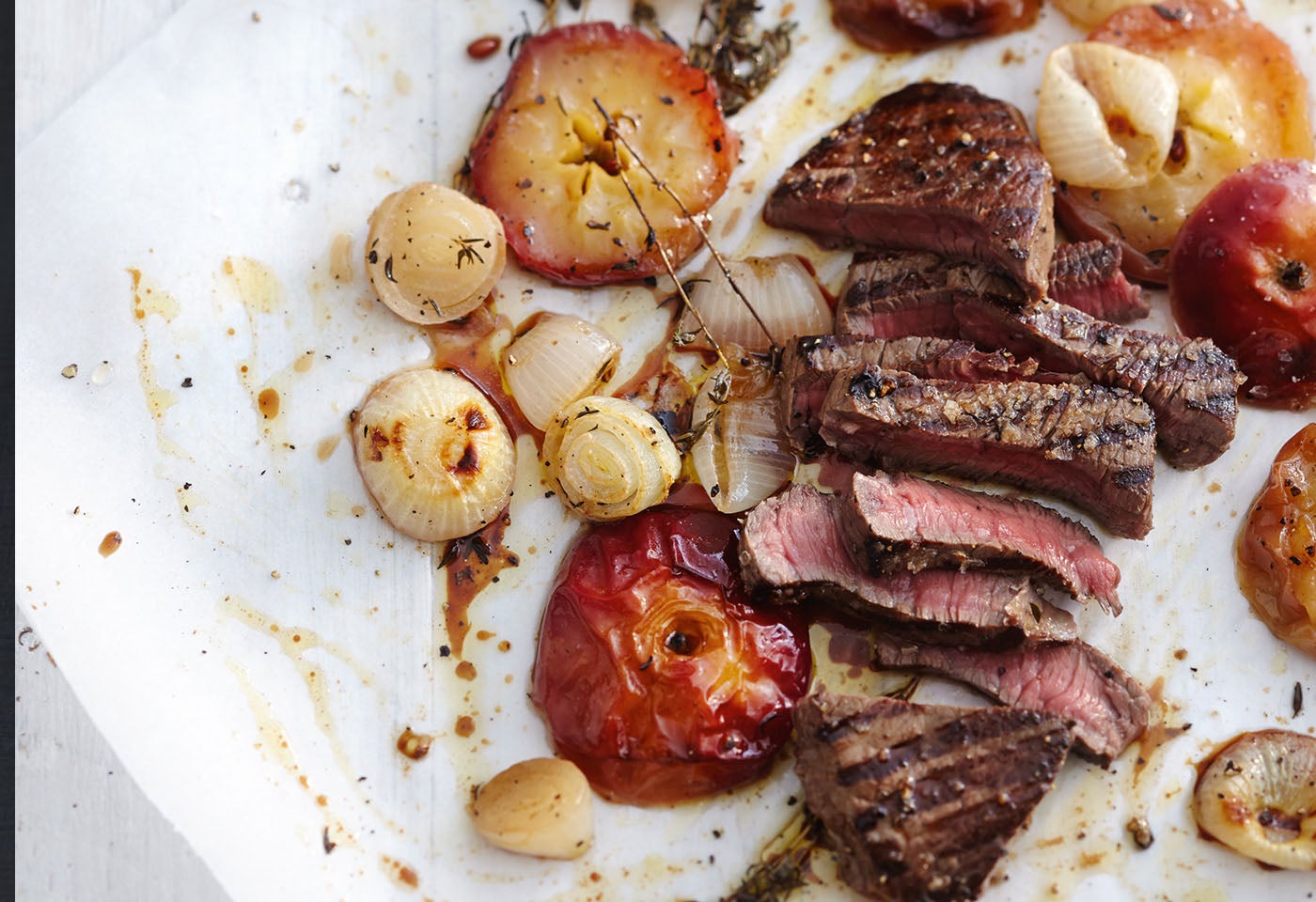 Hüferlsteak mit Bratzwiebeln und Äpfeln