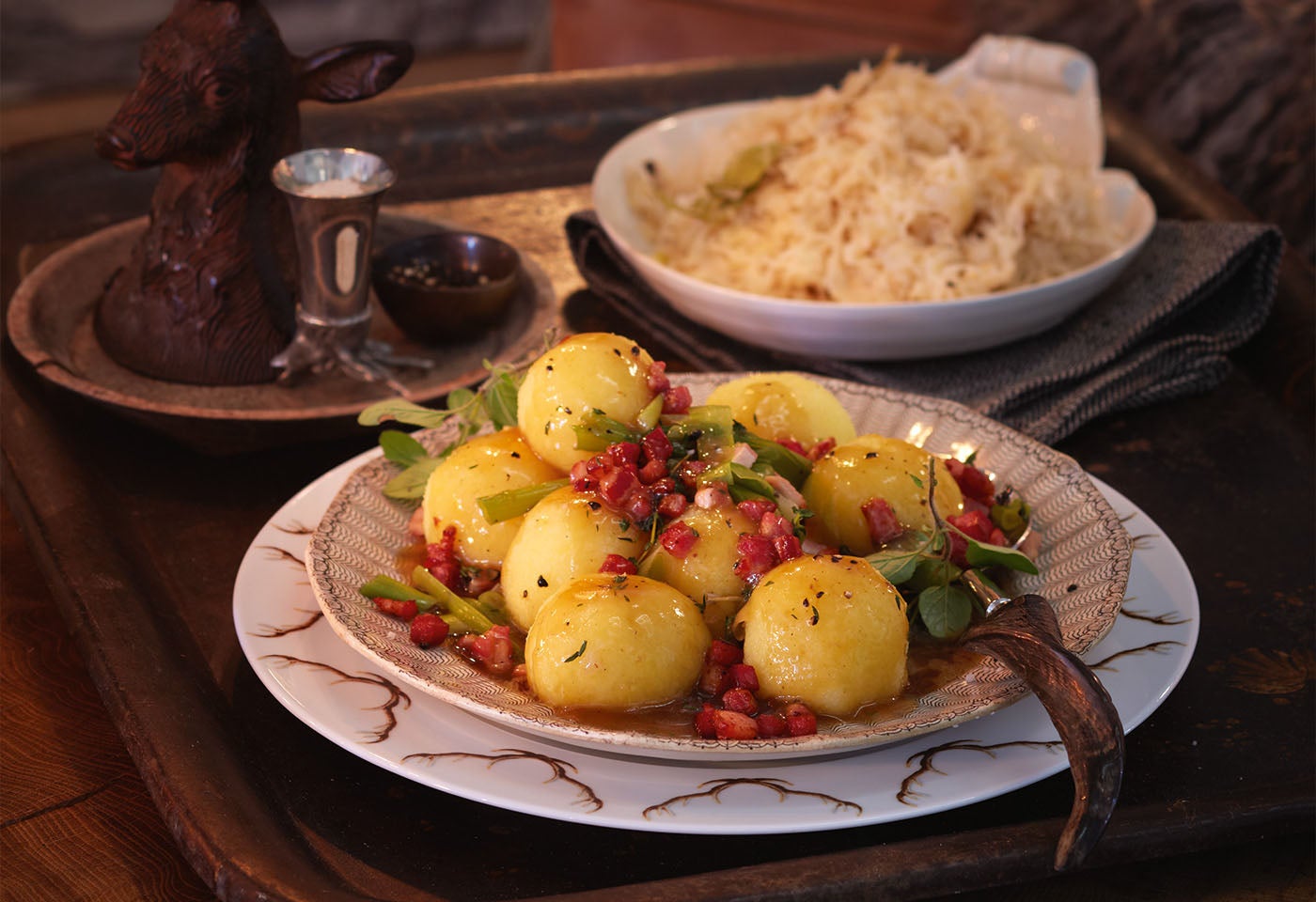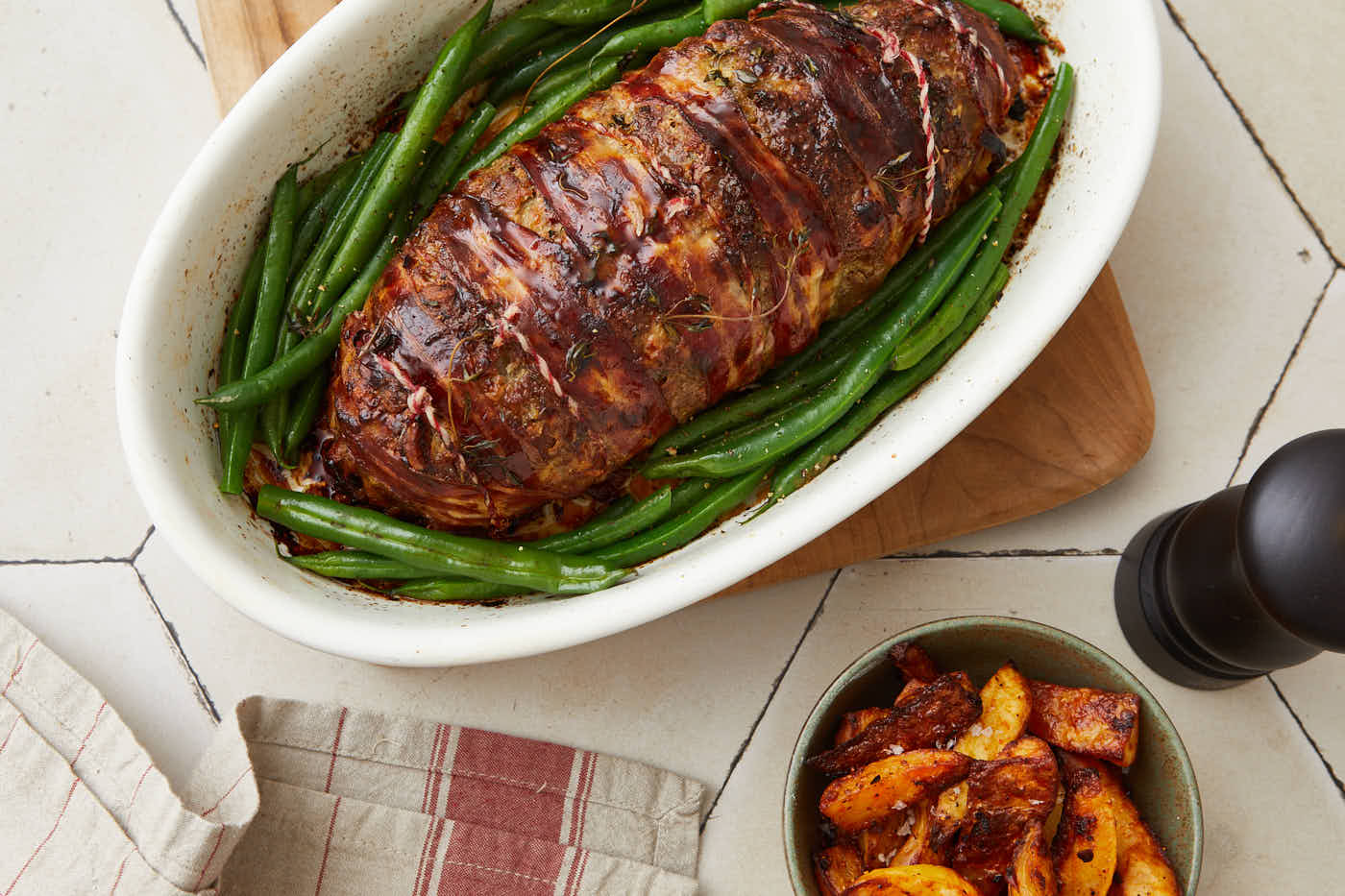 Faschierter Braten im Speckmantel mit Zwiebel-Fisolen und Erdäpfeln
