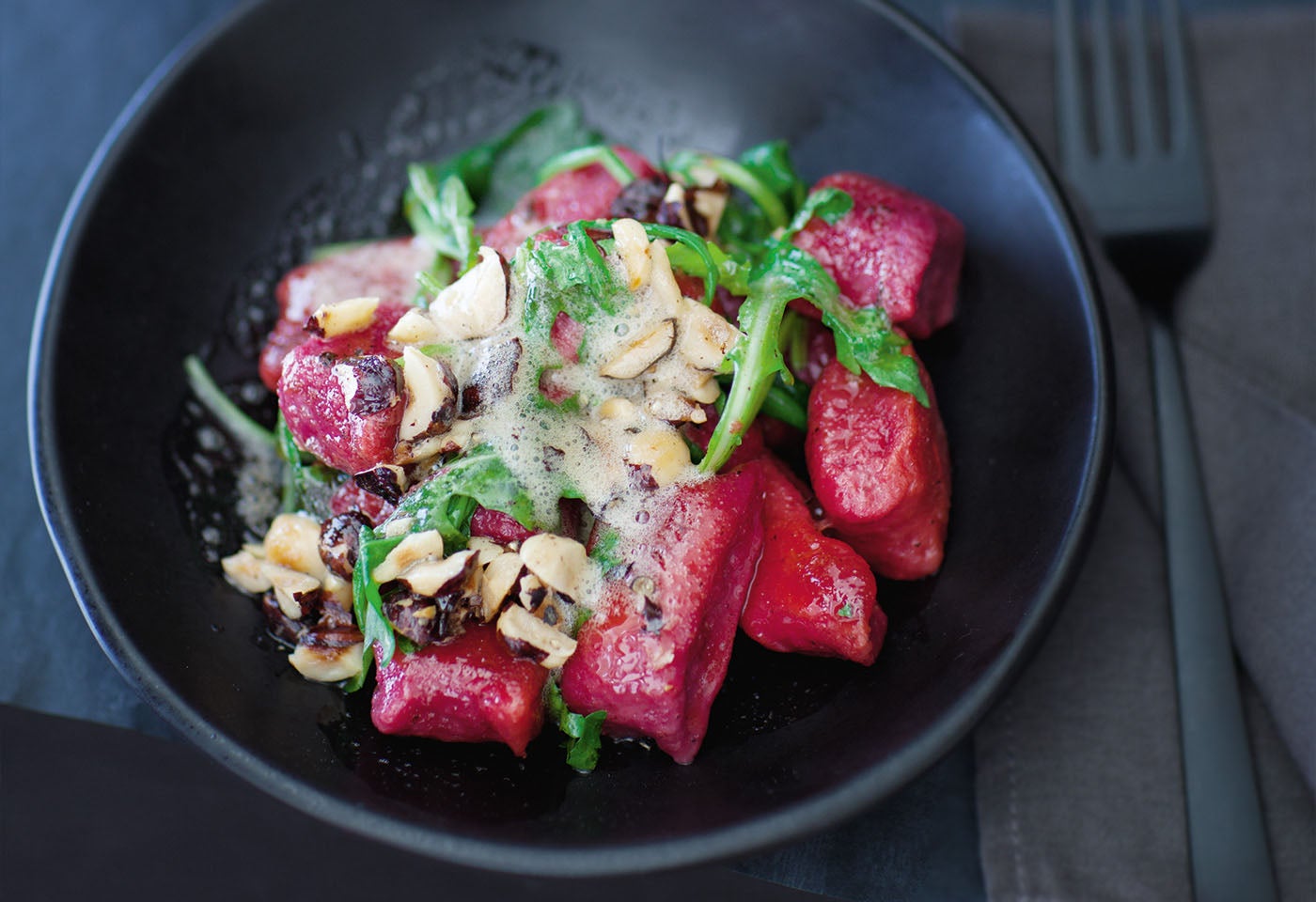 Rote-Rüben-Gnocchi mit Rucola und Haselnussbutter