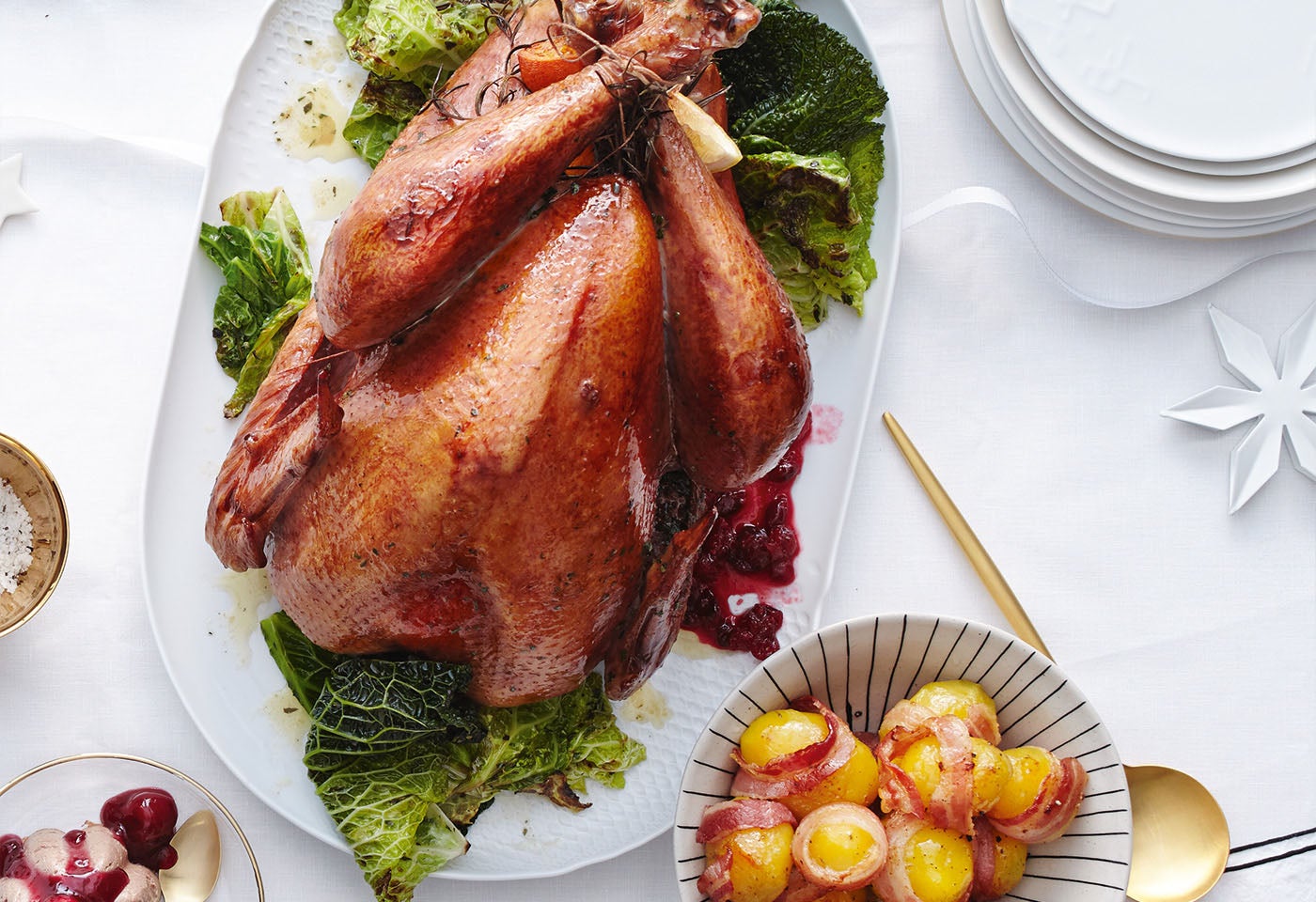 Gefüllter Truthahn mit Orangen-Cranberrysauce, Speckerdäpfeln, Kräuterbutter und gebratenem Kohl