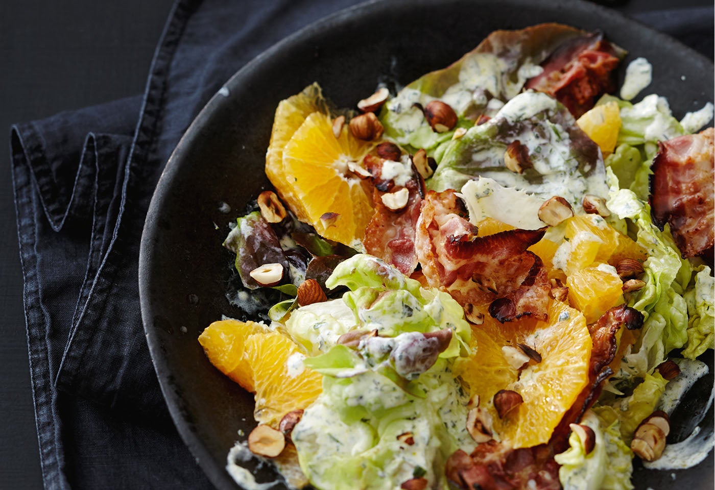 Speck-Orangen-Salat mit Joghurt-Kräuter-Dressing