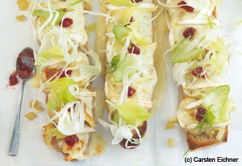 Überbackene Camembert-Baguettes mit Apfel, Preiselbeeren und Fenchel