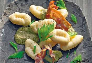 Topfen-Gnocchi mit Selleriepesto und gebratenem Speck