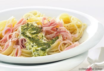 Spaghetti mit Pesto, Sauerrahm und Schinken