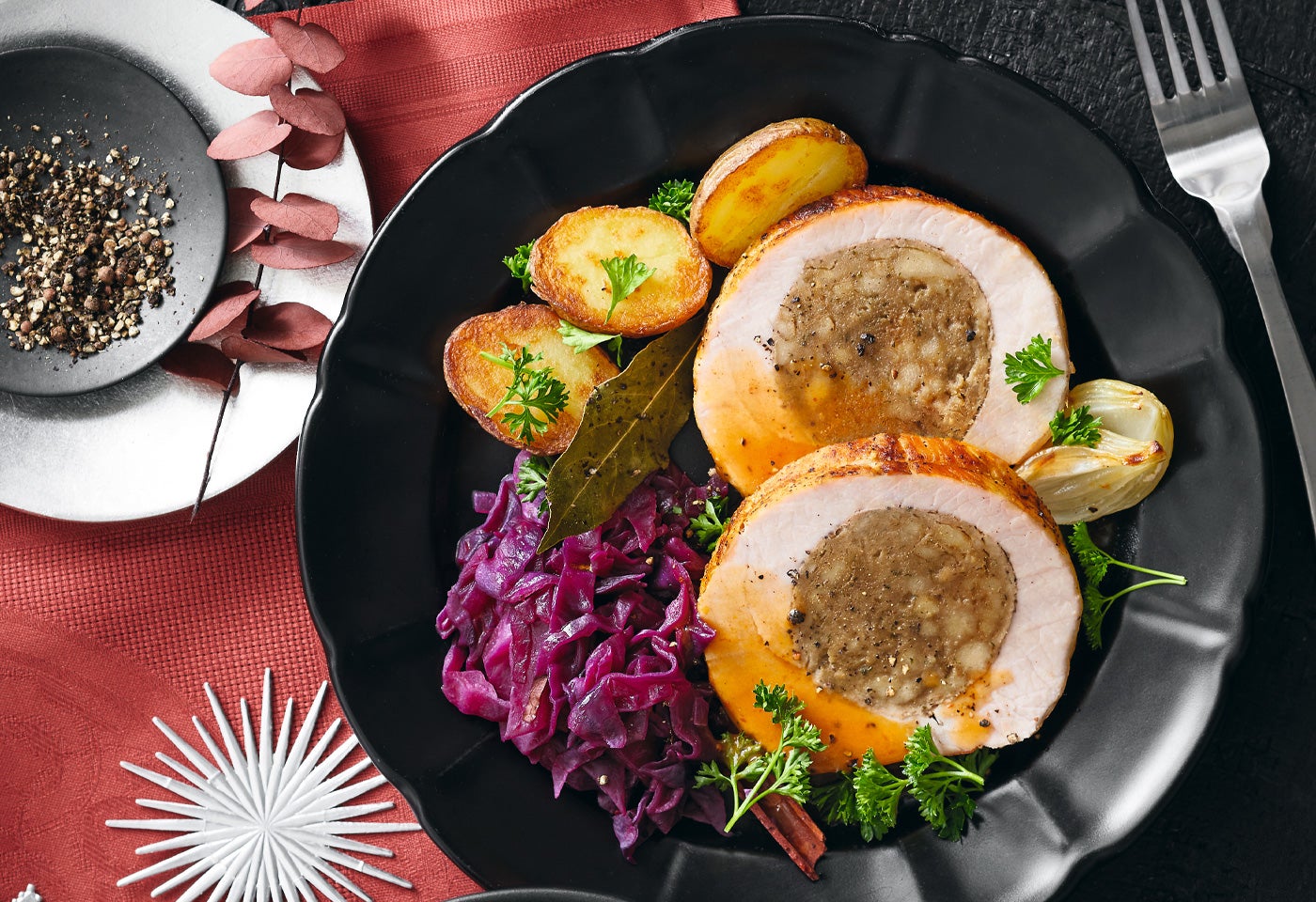 Karreerollbraten mit Orangenrotkraut und Schmalzerdäpfeln