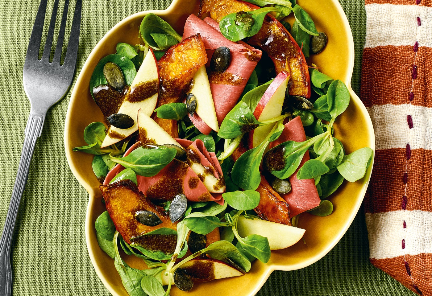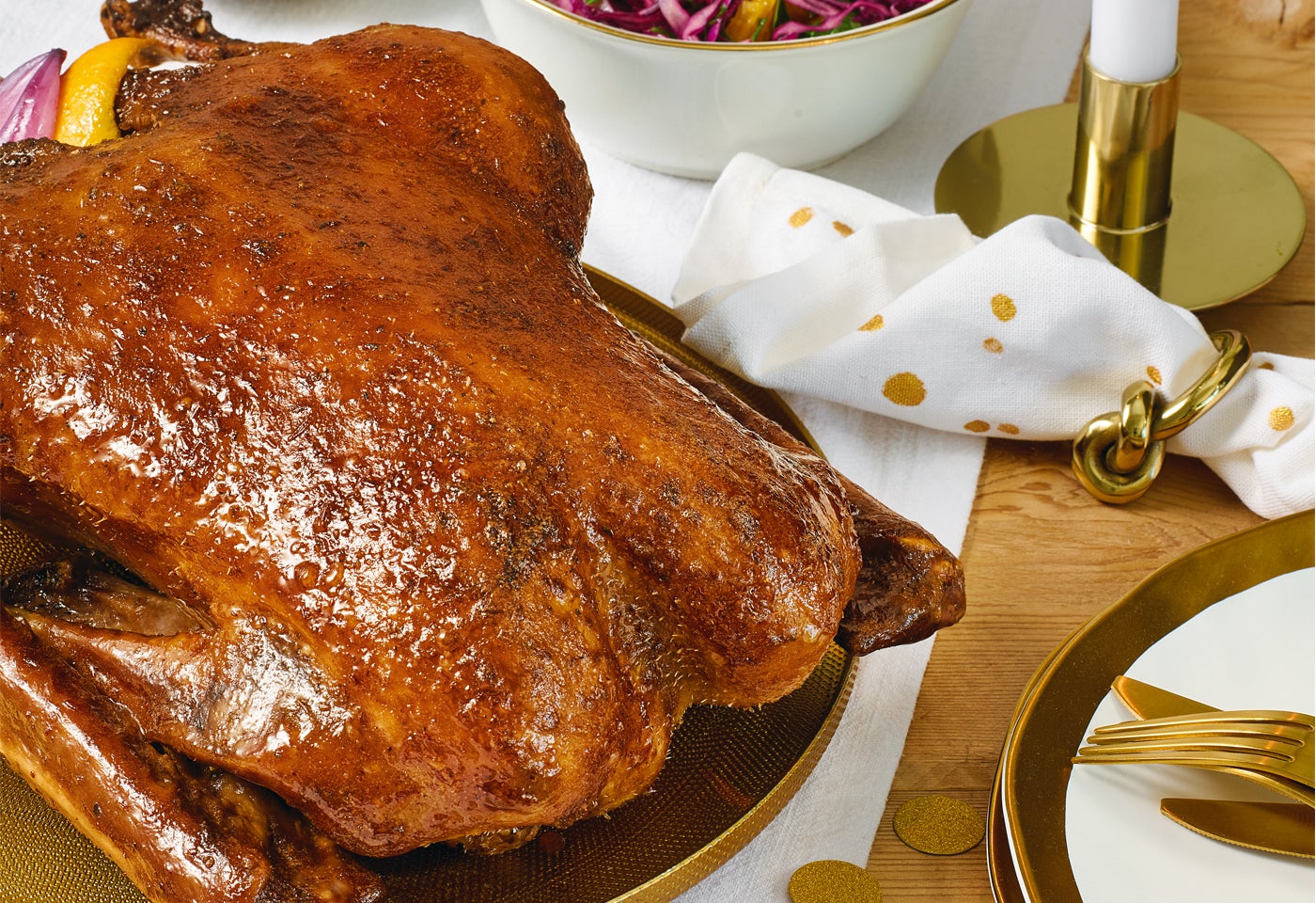 Glasiertes Gansl mit lauwarmem Orangen-Rotkrautsalat und Trüffelknödeln
