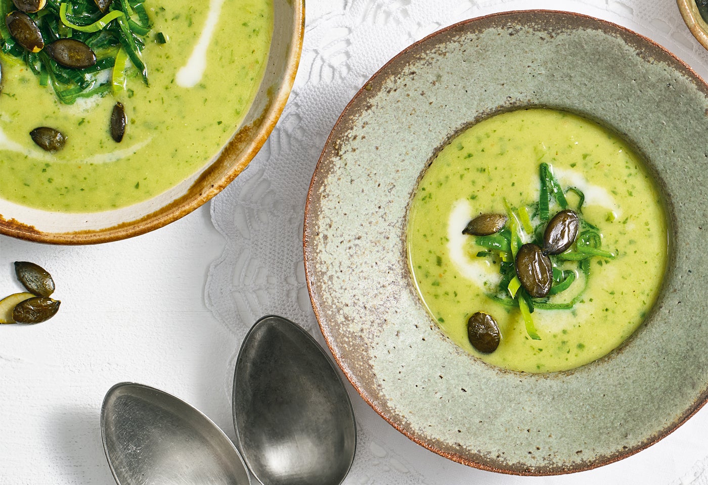 Erdäpfel-Lauch-Suppe mit Kürbiskernmiso