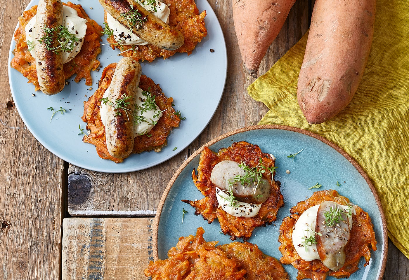 Süßkartoffelpuffer mit Würstelhäppchen