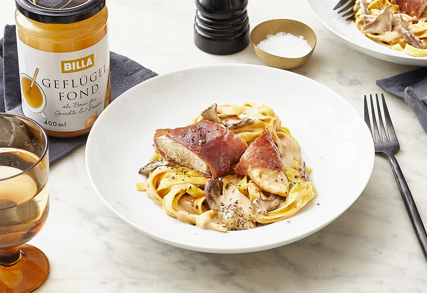 Hühnerfilets mit Prosciutto-Mantel mit Safran-Tagliatelle in Sauce