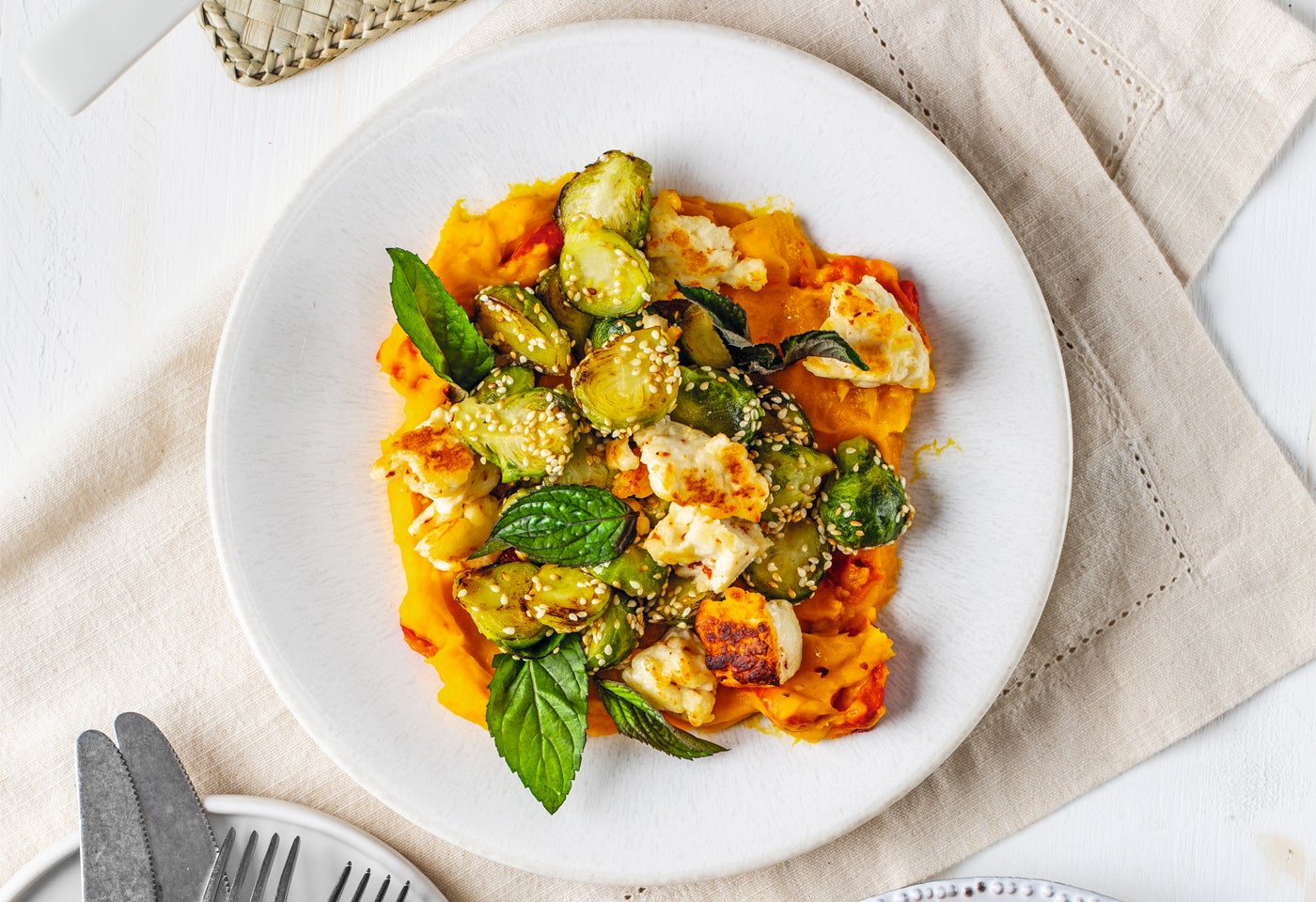 Geröstete Kohlsprossen auf Kürbis-Paprika-Püree