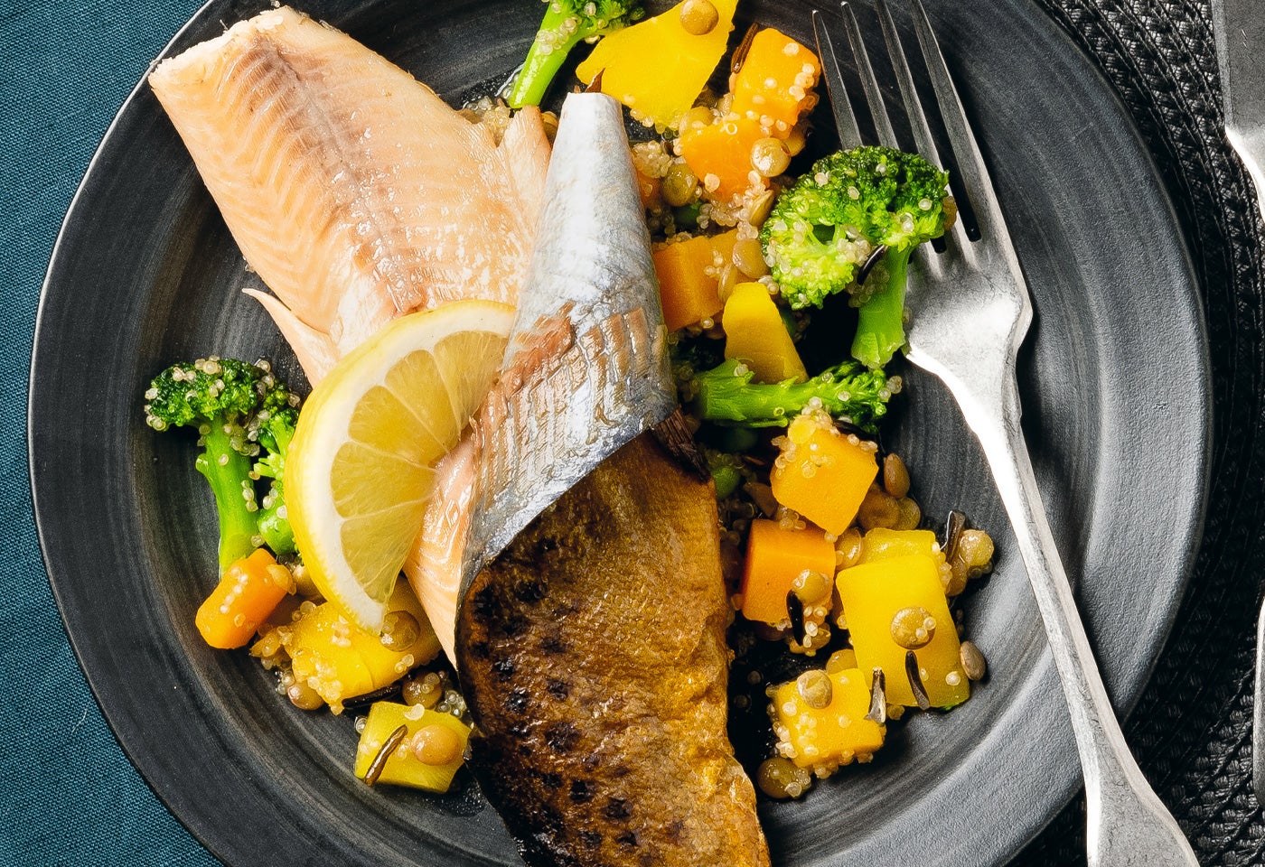 Geräuchertes Saiblingsfilet mit Kürbis-Quinoa-Gemüse
