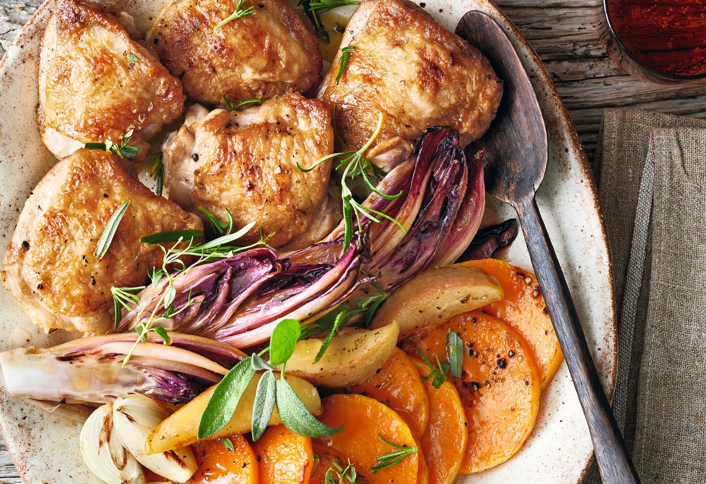 Glasierte Hendl-Oberkeulen mit Kürbis-Birnen-Chicorée-Gemüse