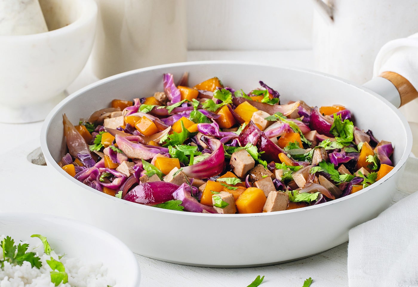 Rotkraut-Kürbispfanne mit Räuchertofu