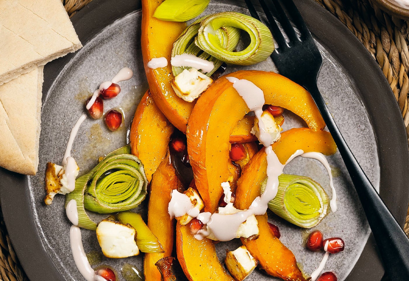 Ofenkürbis und -lauch mit Feta und Granatapfel-Dip