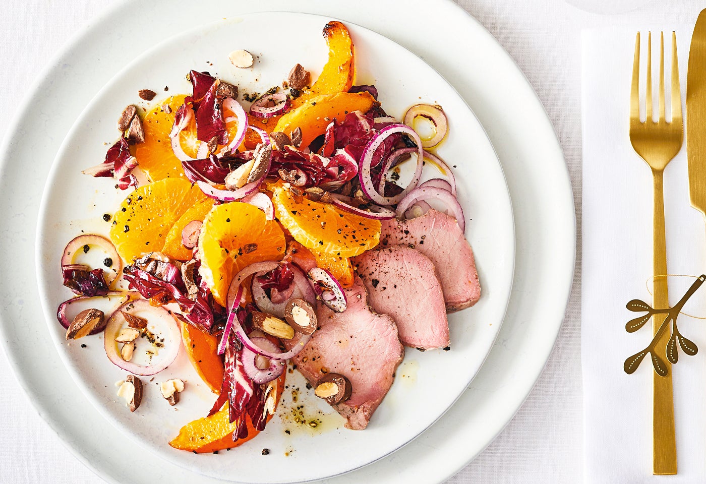 Lauwarmer Kürbis-Radicchio-Clementinen-Salat mit Wildschwein-Karree