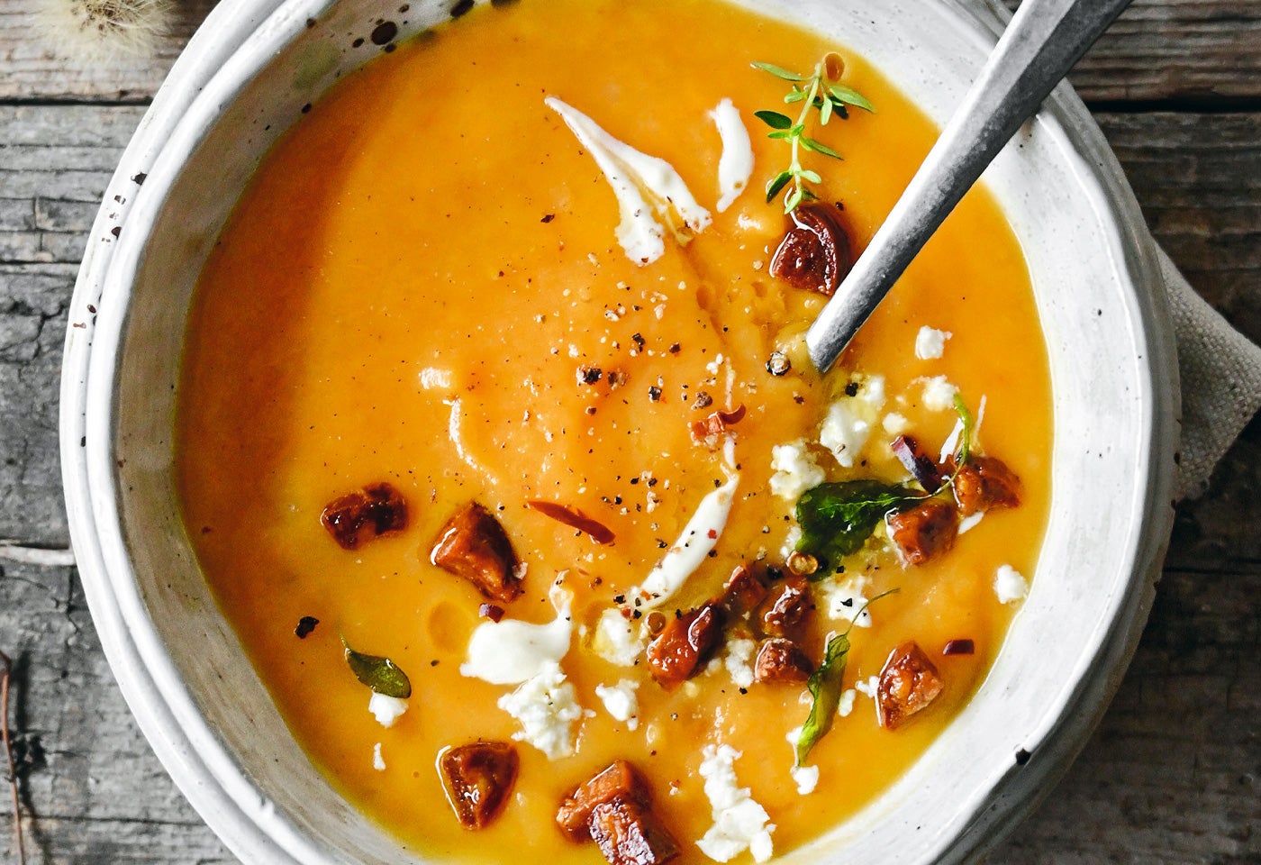 Apfel-Kürbis-Suppe mit süß-saurem Kürbis und knusprigem Hendl