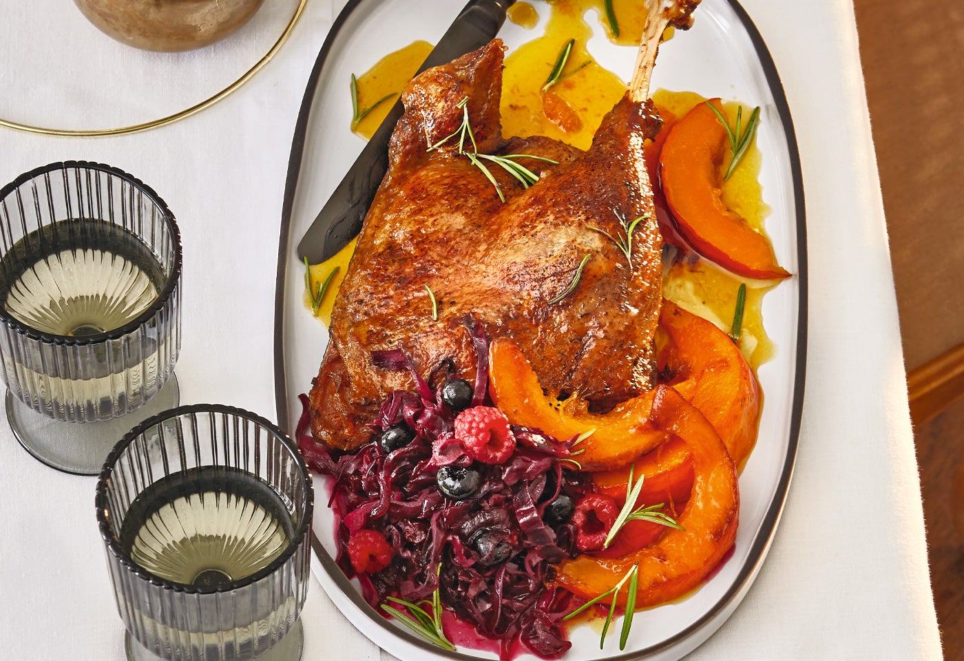 Schnelles Martinigansl mit Beerenpunsch-Rotkraut und getrüffeltem Kürbis