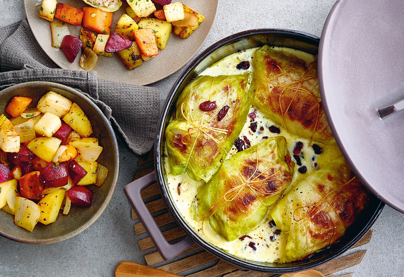 Lauch im Backteig und Ofenkürbis mit Ribiselvinaigrette